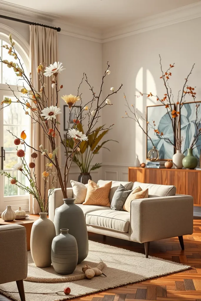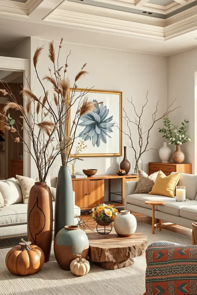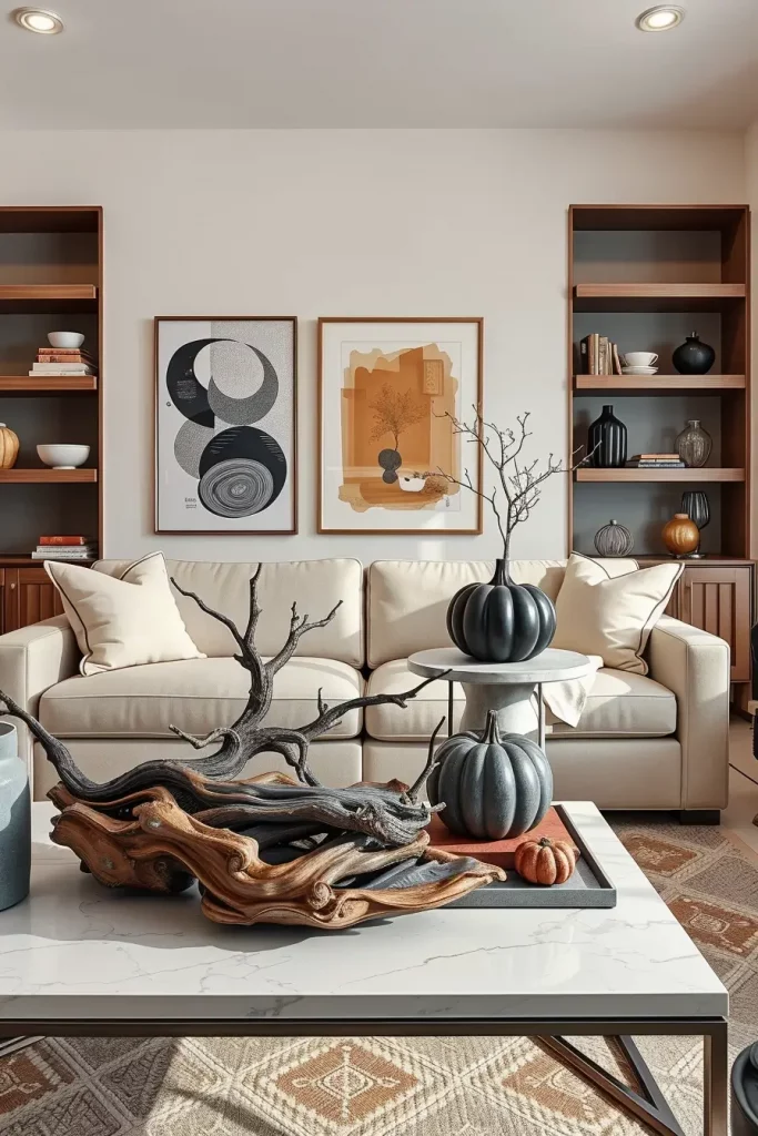 The more sophisticated of the fall living room decorations, as we look deeper into the season that I have adopted in 2025 is the use of organic sculptures and dramatic seasonal centers. These artistic highlights introduce a gallery-like setting, but without a cold feeling, but with a richness of seasons. They may also reside on coffee tables or low display pedestals or even on consoles to help in uplifting a minimalist space.