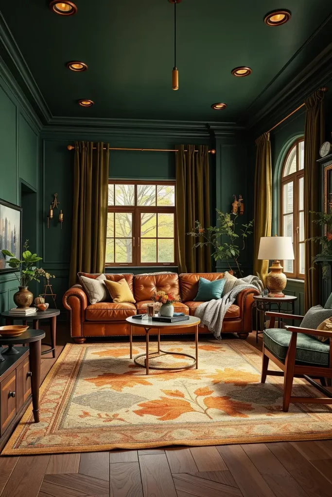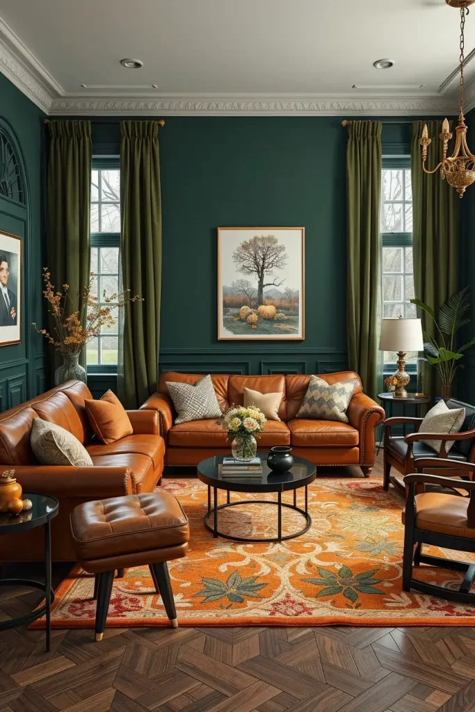 Not many combinations are as autumnally high-fashion as those of deep green and cognac-leather. I employ these saturated, intense colors when I would like to infuse drama without loss of coziness. Dark green walls or accents provide a grounded effect whereas cognac leather furniture provides textural appeal as well as timelessness. This is an efficient palette to be applied in both modern and classic interior.