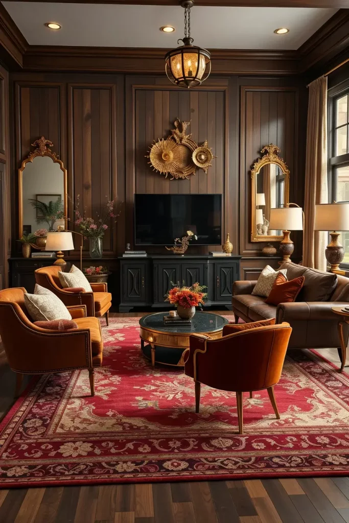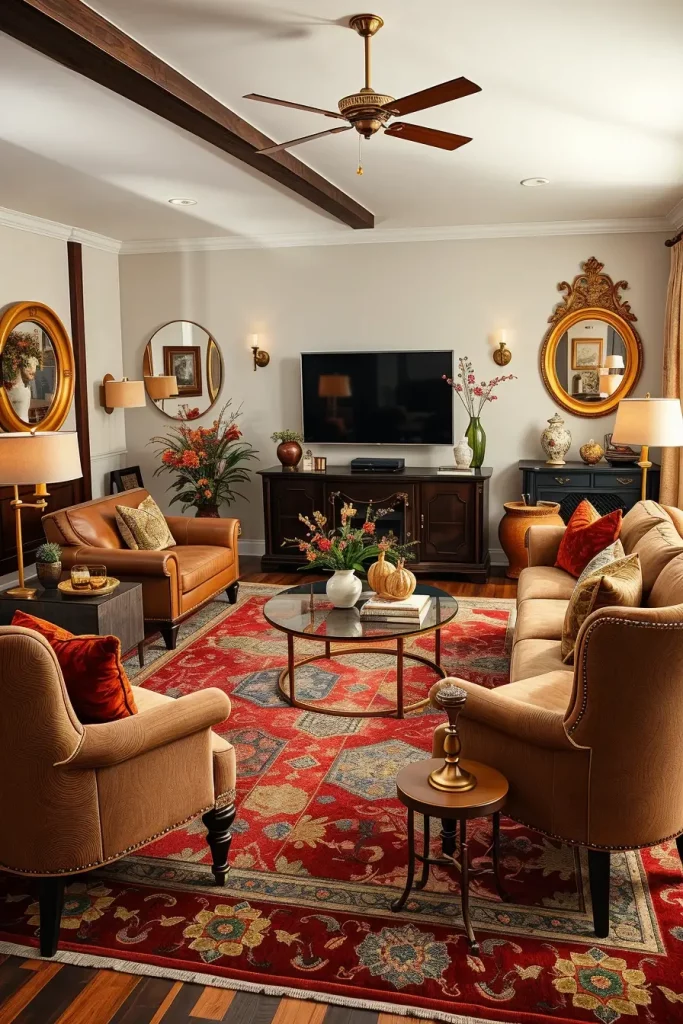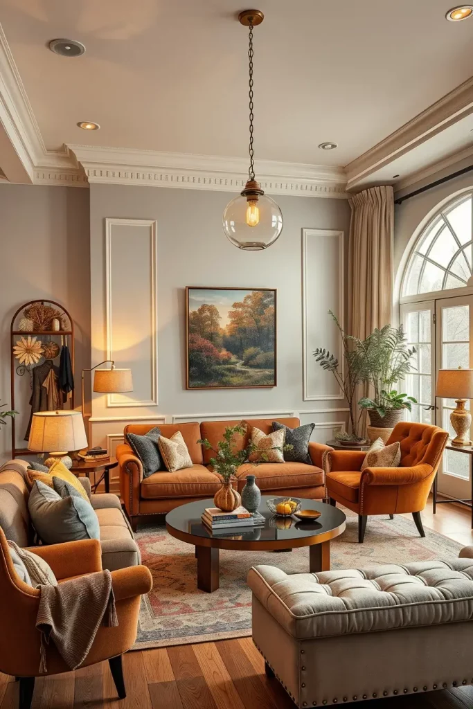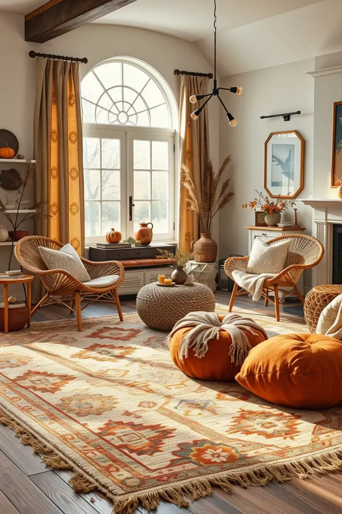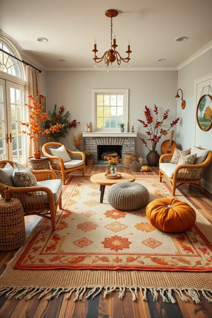 I would enhance this appearance more by offering antique-style area rug of burgundy and moss green. This is a touch that unites the natural fall colors as well as supports the vintage look. The arrangement can be further finished off with a low bookshelf decorated with old ceramics and books that are carefully selected.