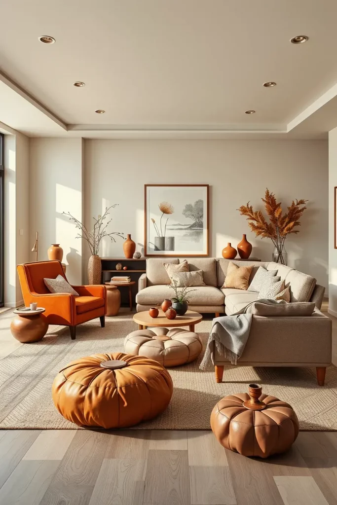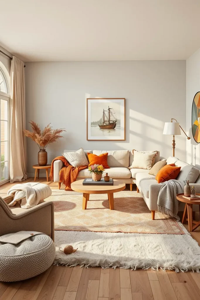 I’ve always believed fall begins with color. Burnt orange and terracotta are the best fall living room decor ideas in 2025. These earthy colors are warm, but they do not overwhelm the room. The rust-inspired colors can be introduced into the surroundings in the form of accents with the help of a neutral base, i.e., walls painted cream and covered with soft beige sofas. Introducing such colors in an elegant way by using textiles or small furnishings makes things not very thematic.