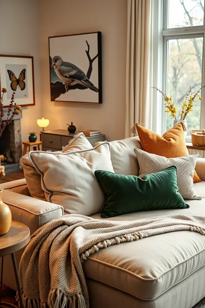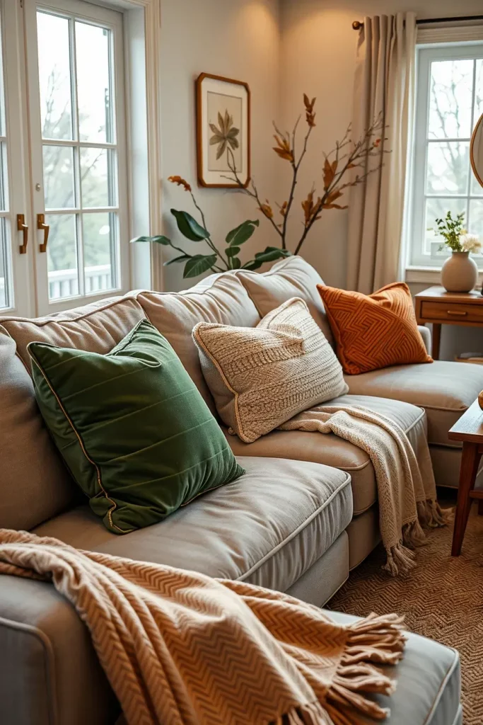 The easiest way to give an autumn makeover to a living room in 2025 is the use of throw pillows, and sophistication in design comes in the form of adapting to seasonal elements, without the stereotyped images. I suggest working with thicker materials such as boucle, tweed (wool-blend) and velvet in the colors of aubergine, caramel and deep olive.