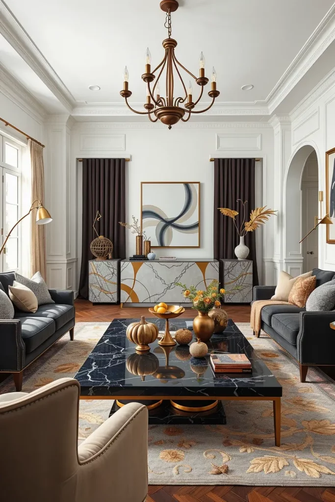 I tend to go bold but elegant in fall to wear marble and metal ensembles. Although such materials are not necessarily believed to be seasonal, they can be combined with fall decor ideas and still look wonderful when staged appropriately. Curvy marble coffee tables, travertine siderooms and blackened steel lamps are popular in 2025.