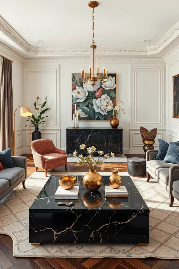 As an example, a coffee table made of white-veined black marble anchors a room, and a burnished bronze floor lamp, as well as brushed brass candleholders, provide a warm touch. I discover that one insert at least large scale piece of marble makes the room look deliberate and luxurious.