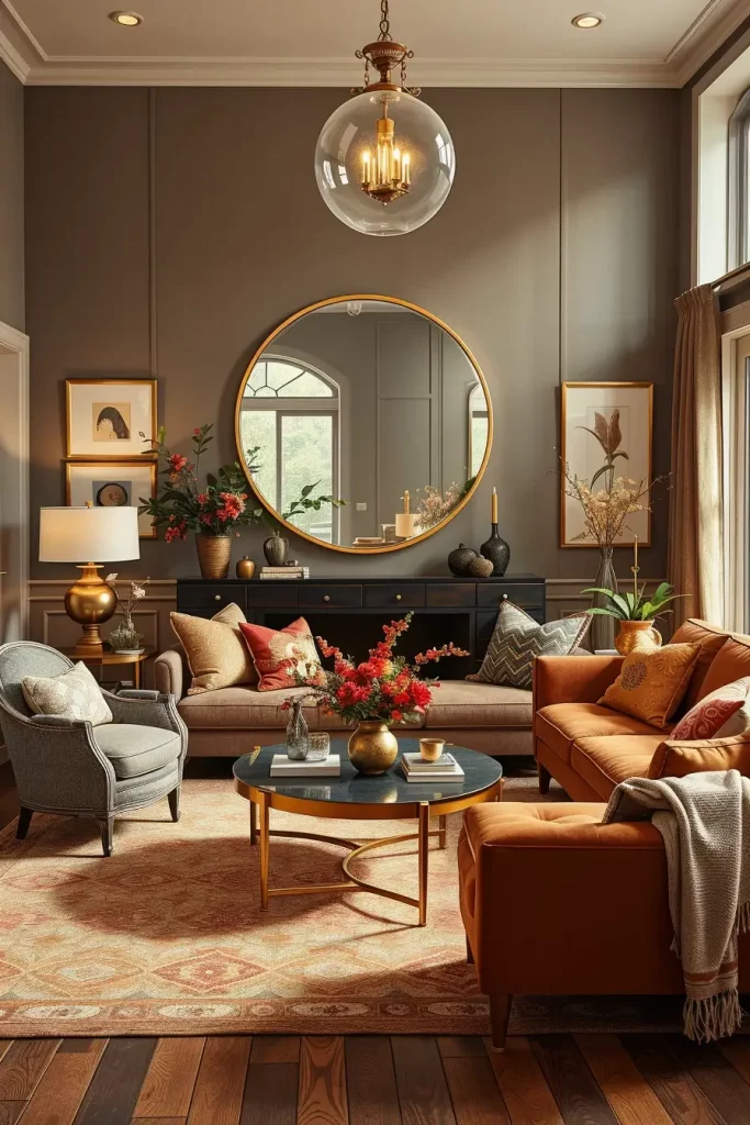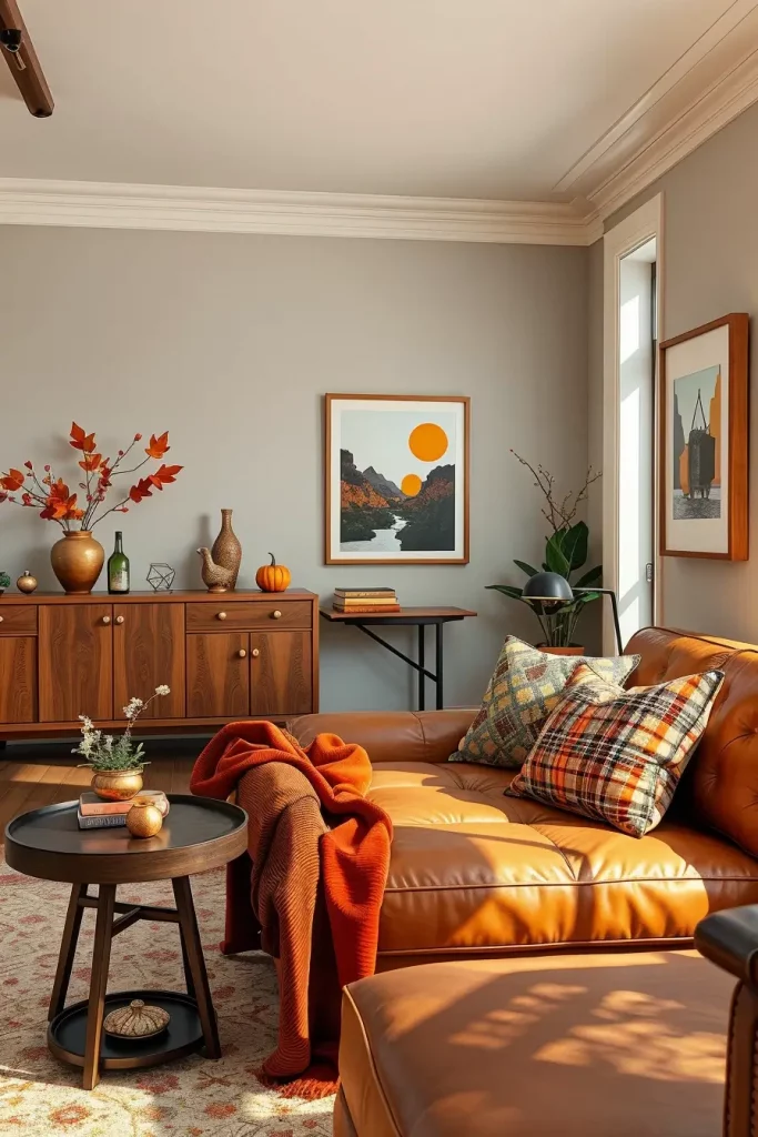 Walnut wood credenzas, low sofas in camel leather and curved accent chairs in place of rust velvet throws and plaid covers. I love to have products of the time, so I tend to incorporate tapered leg furniture and starburst mirrors and add fall accents such as brass candleholders and ceramics that are earthy colors.