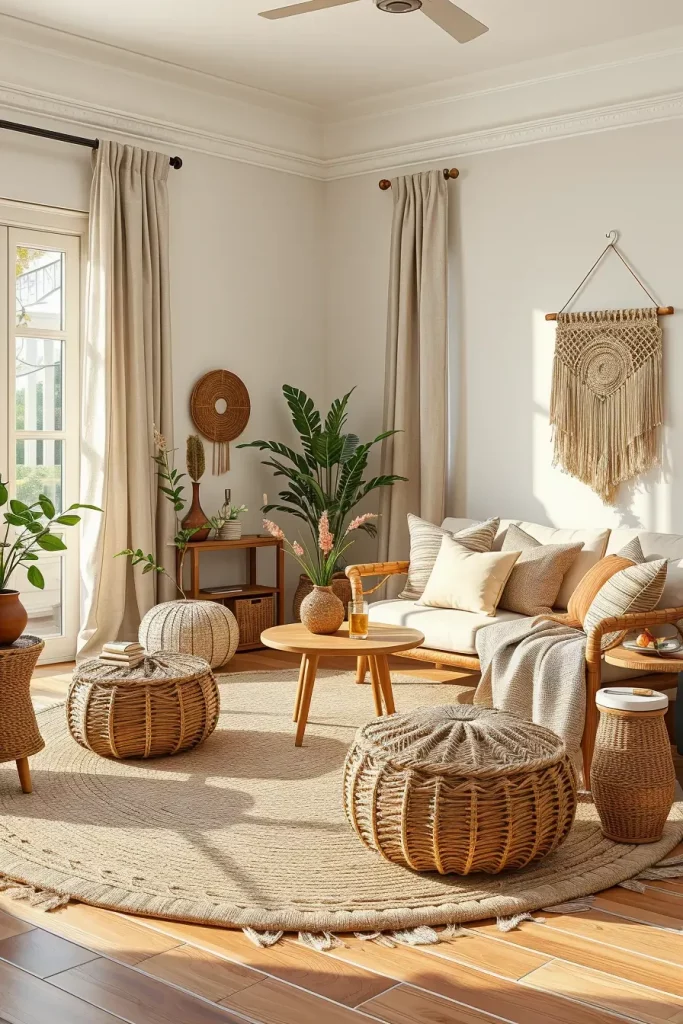 And the first thing I would do would be to put a huge woven basket alongside the fireplace to toss the throws, followed by a cane junked-up side table, and maybe a natural fiber tapestry on one of the walls. These works are down to earth yet tactile yet not rustic. Combine with a linen curtain or a jute carpet to complete the picture to the full.