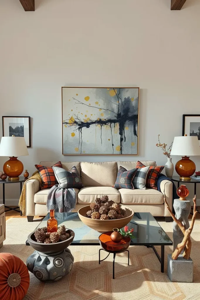 To this end, I typically start with a big modern painting or a collection of black and white minimalist prints above the sofa. Then I introduce touchy fall accents: a woolen plaid weave throw, a ceramic lamp in rusty color, a bowl on a coffee table which is filled with pinecones and clove-scented candles. This isn t a struggle between form and feeling it sets down the space on an emotional level but leaves it optically unencumbered.