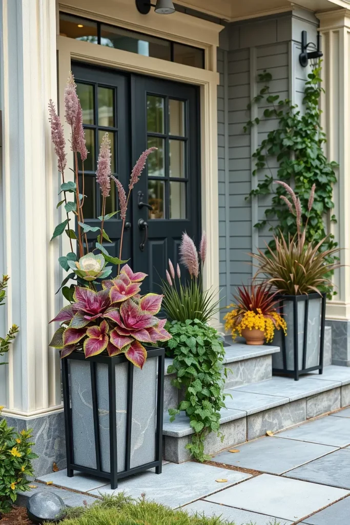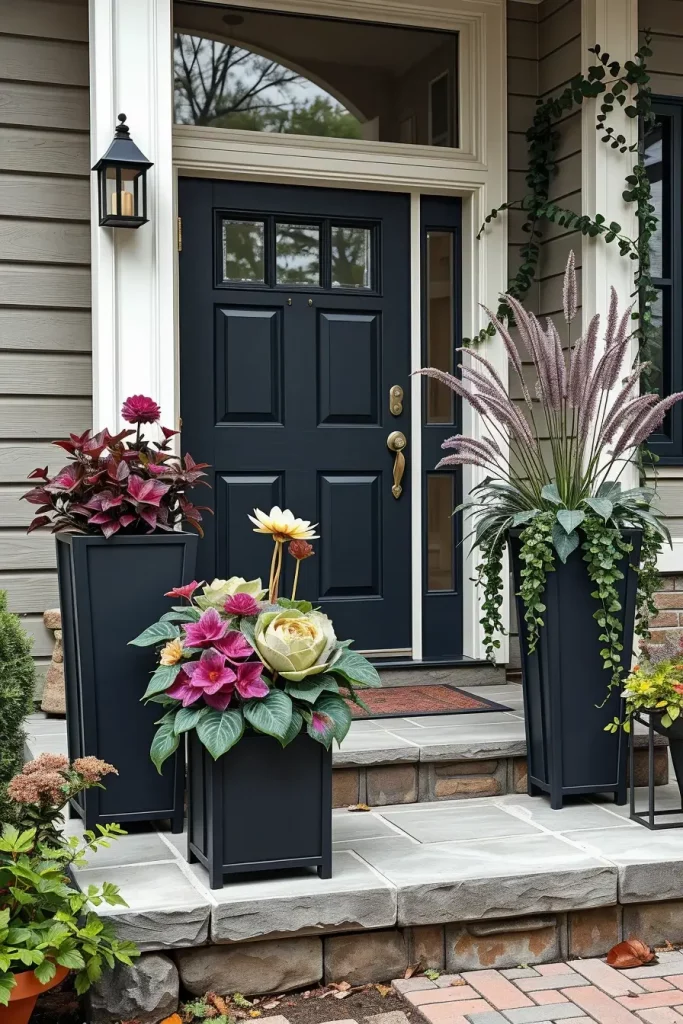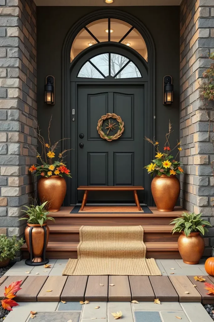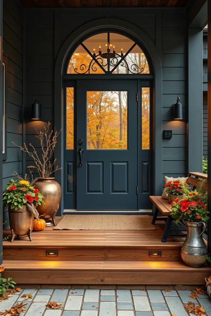 I have always felt that the entryway is the first impression of your whole house and fall is the time to make that first impression rich in color and texture. To achieve a luxurious appearance in 2025, I suggest using a deep saturated color on your front door such as midnight blue, charcoal or oxblood. Place large double planters in black matte or burnished copper on either side of the entrance. A light touch of uplighting placed under the steps or the side rails will provide a friendly atmosphere at night, and an arched mirror or a window with a vintage design above the door can enhance the whole construction.