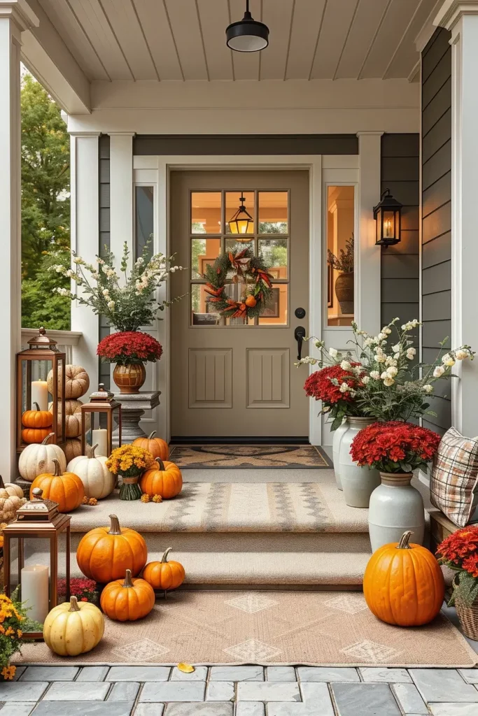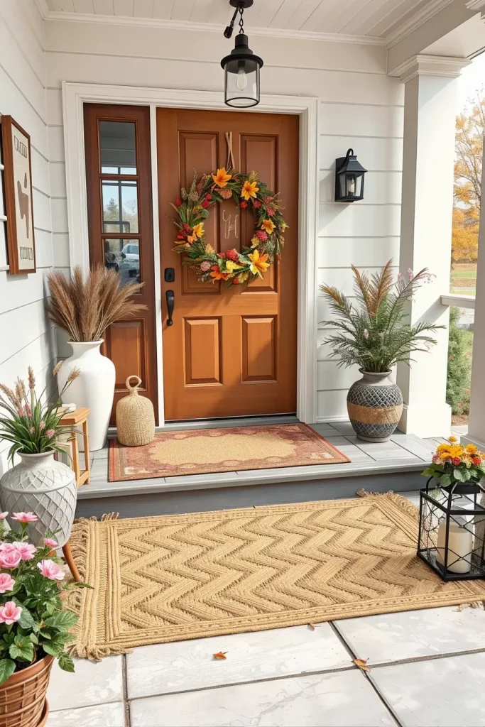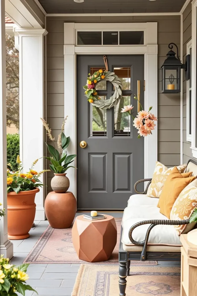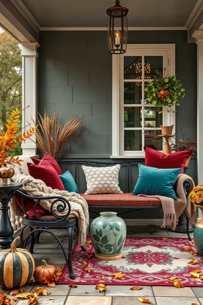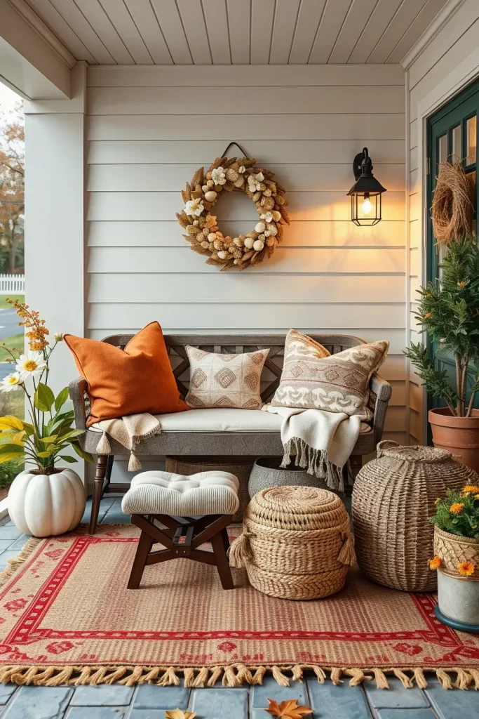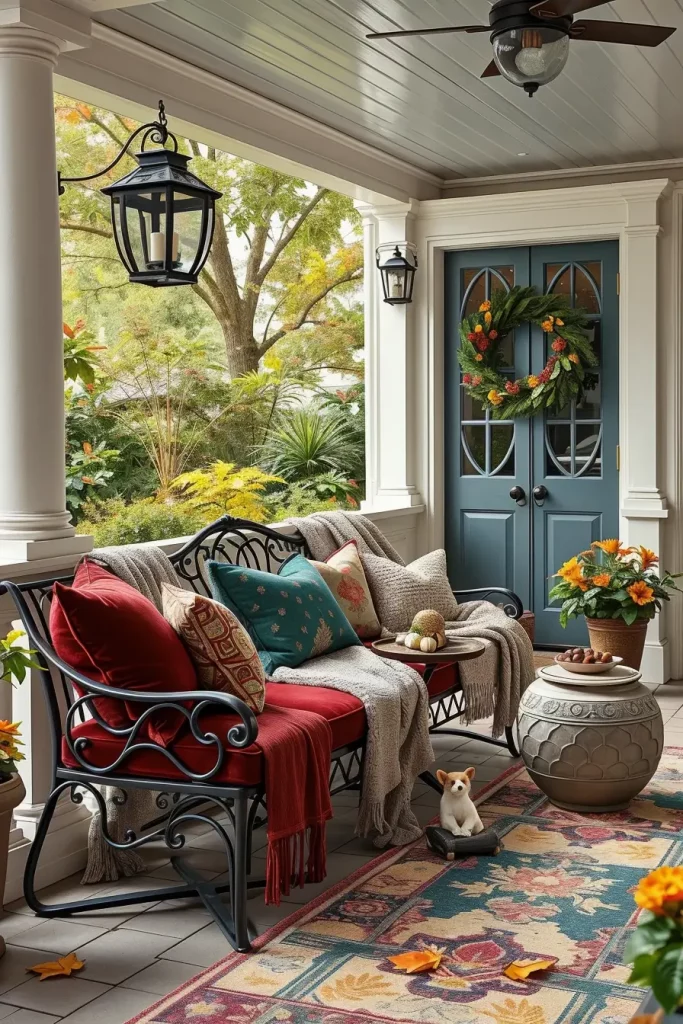 In my fall porches, I use neutral furniture, such as beige or gray seat cushions and add seasonal colors with accents: rust-colored pots, mustard yellow cushions or sage green door wreaths. These colors are vivid and sophisticated. A ceramic stool made of clay-pink or a matte slate lantern immediately upgrades the composition and appears timeless.