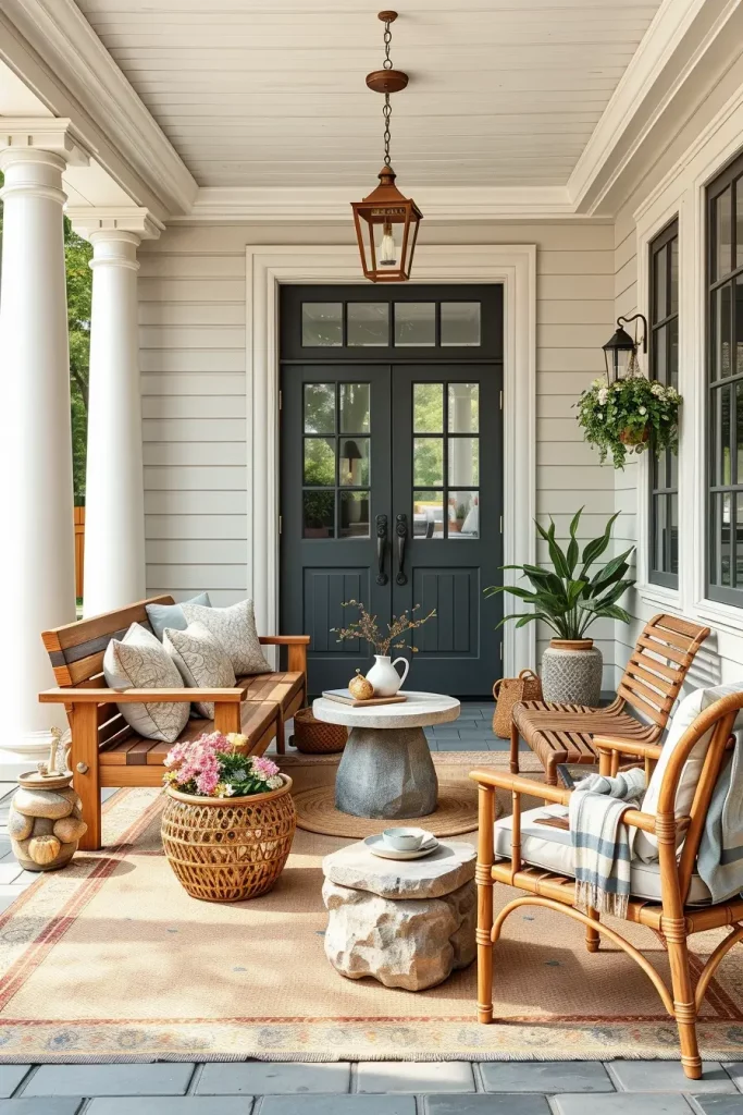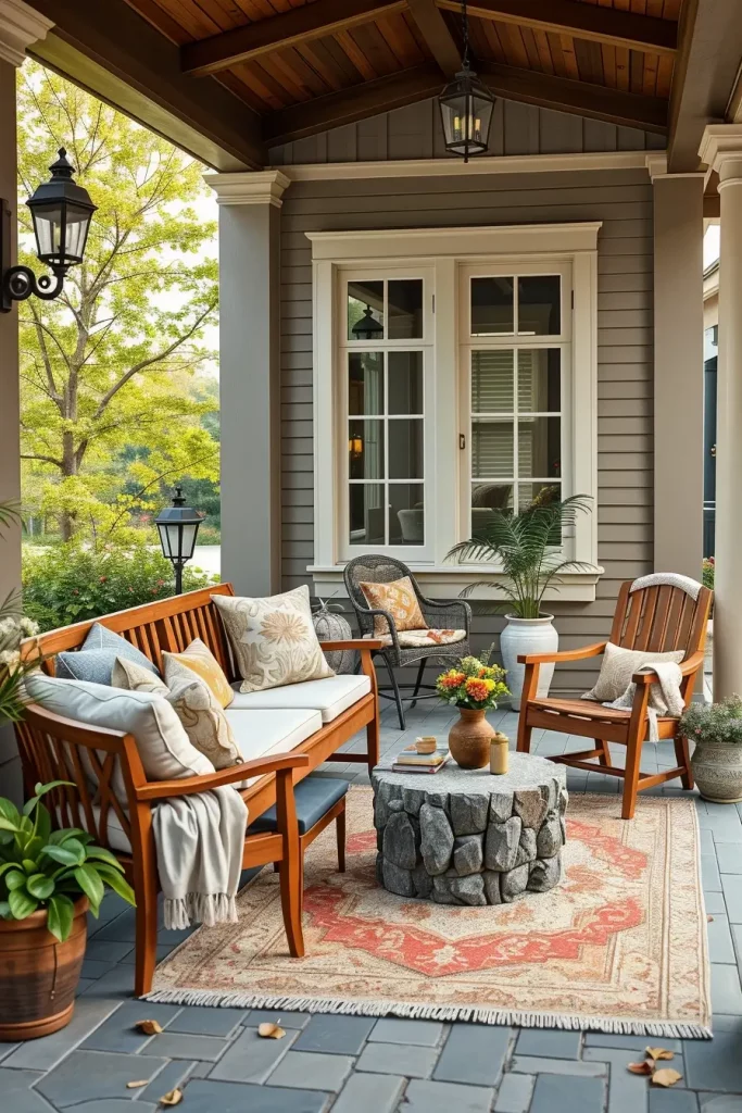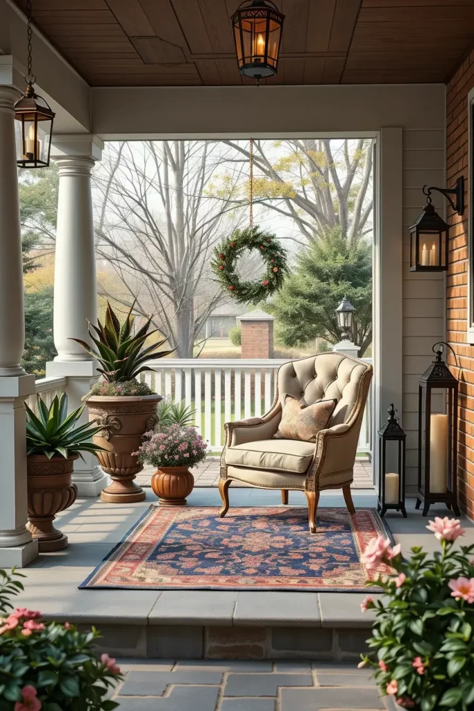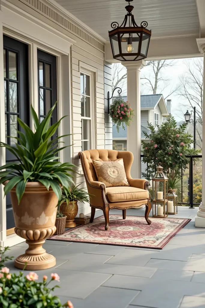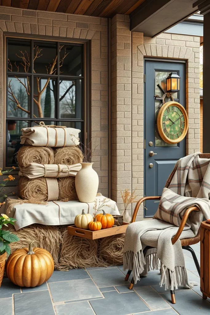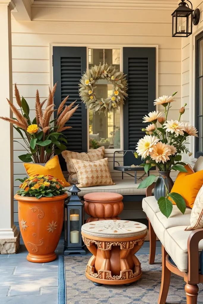 In my fall porches, I use neutral furniture, such as beige or gray seat cushions and add seasonal colors with accents: rust-colored pots, mustard yellow cushions or sage green door wreaths. These colors are vivid and sophisticated. A ceramic stool made of clay-pink or a matte slate lantern immediately upgrades the composition and appears timeless.
