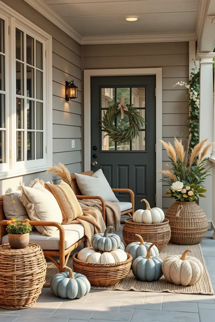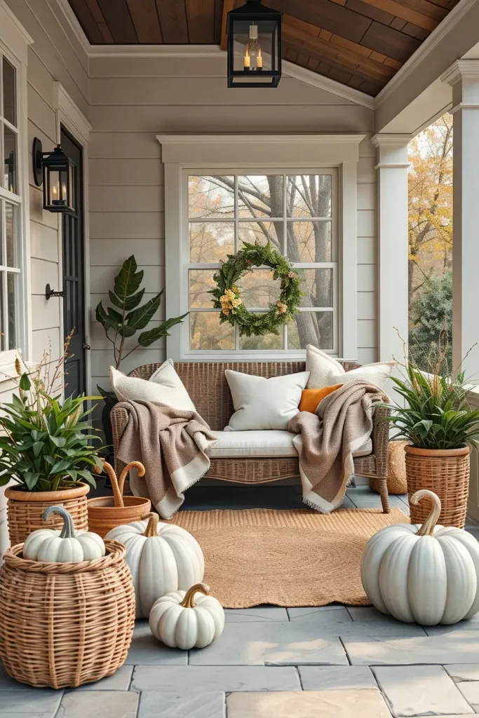 I have piled a sand-colored bench cushion with an off-white throw on my porch setup and placed soft gray ceramic lanterns on each side. I do not use much color, however, I concentrate on the way the light plays with the textures. The pumpkins I put are even in cream and stone.