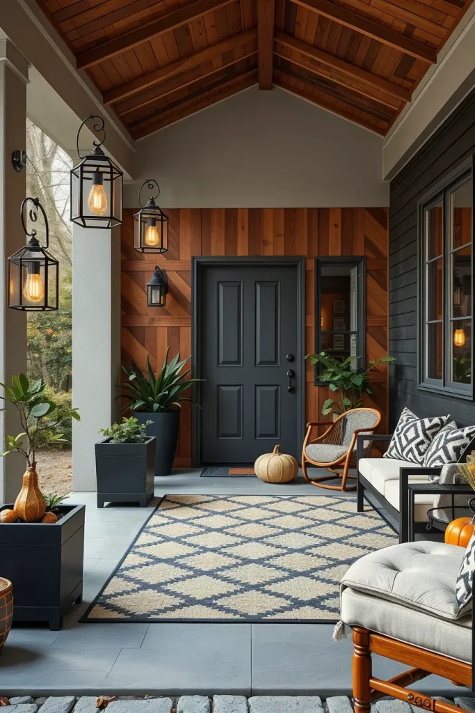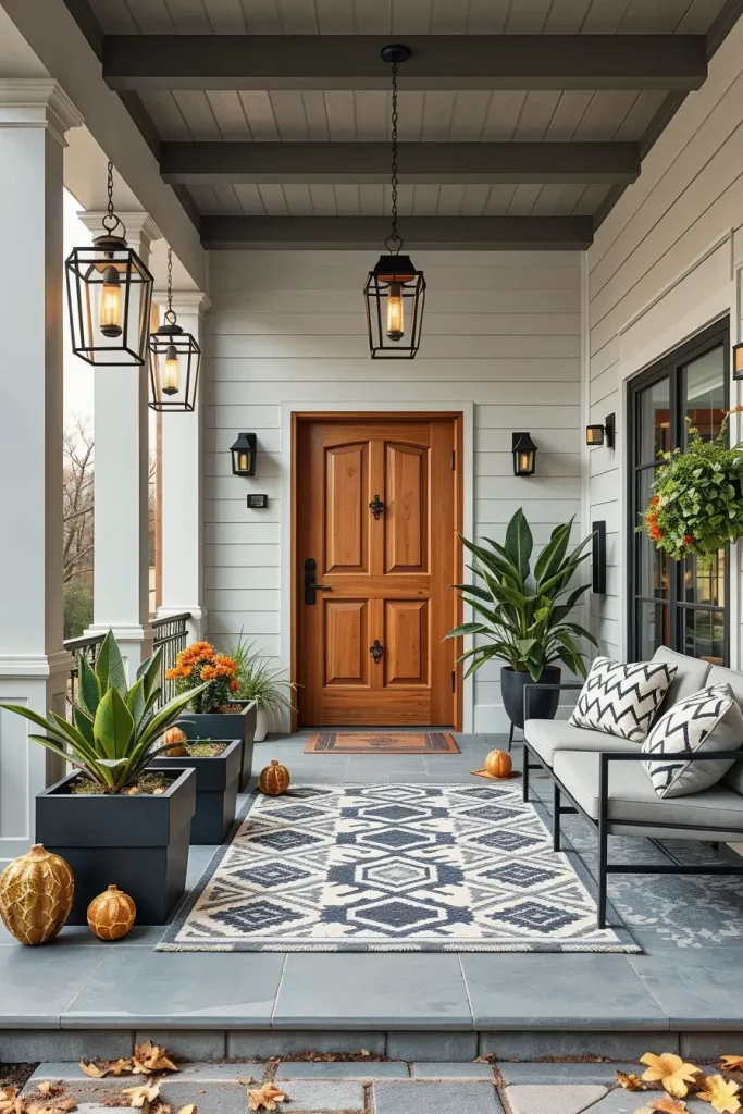 I usually suggest going geometric to clients who adore clean lines and crisp design. Architectural interest and modern appeal is provided by geometric fall decor that does not overpower the porch. To establish a unified rhythm, I apply diamond-patterned rugs, hexagon-shaped lanterns, and square black planters. The secret is repetition- echoing shapes with different pieces so the design seems to be one.