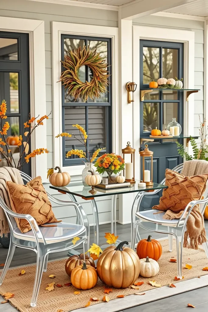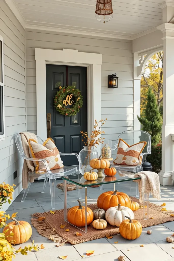 To get a contemporary and clean take on classic fall decor, I prefer to begin with acrylic pieces. These light and weather-proof items add a classy touch to the porch and leave other design elements to stand out, such as pumpkins or planters. Acrylic furniture and accessories are especially good in small spaces, where visual clutter may be a problem. Clearly, the use of materials contributes to the open and airy look without compromising functionality and seasonal appeal.