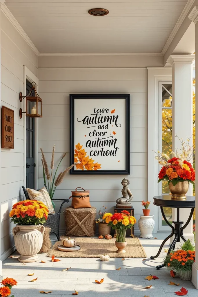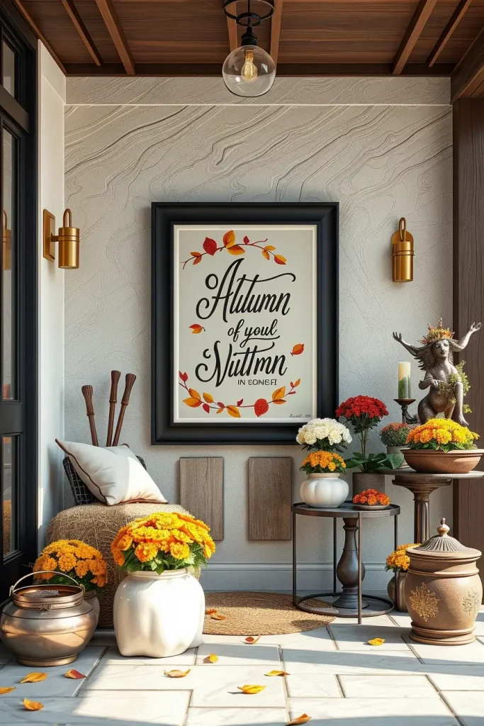 I also tend to recommend the use of framed signs in the style of fine art prints to make your fall porch decor more sophisticated and gallery-like. These art-themed signs are more than the Welcome Fall boards that we have been seeing over the years. Rather, they employ serif fonts, dull color schemes, and painterly elements that look like items in luxury interior shops. They are placed at the right place, and they instantly improve the appearance of any outdoor entry.