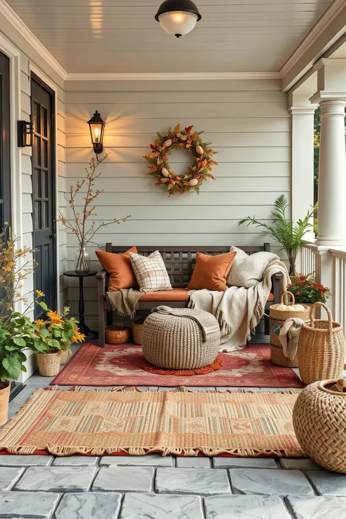 One of my favorite fall decorating tips is to layer, and the outdoor textiles are a great place to use this tip, with rugs and throws. Overlapping various materials, such as wool, jute, and faux fur, I make the porch area as comfortable as an indoor living room. This haptic abundance ensures that your house becomes warm and welcoming at once.