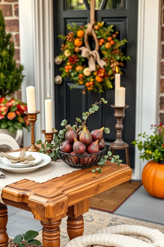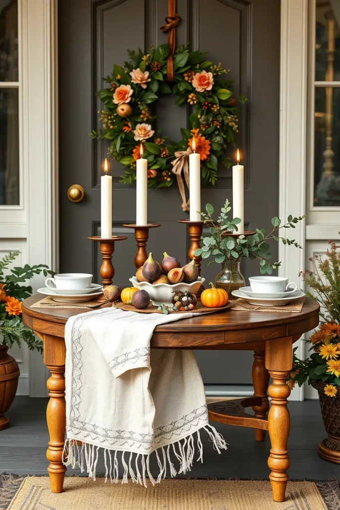 The front porch has a mini harvest tablescape that is a shocking yet classy addition. I adore the mini bistro tables or console arrangements with mini pumpkins, candles, layered linens and flowers. This forms a styled moment that is welcoming, particularly to the guests who are approaching the entry.