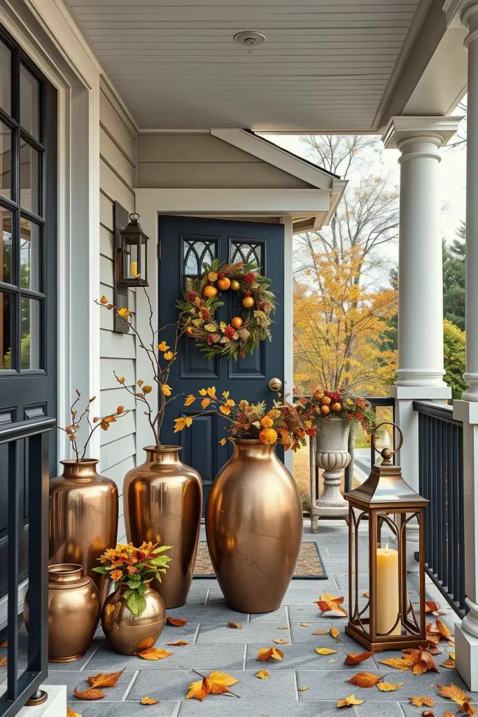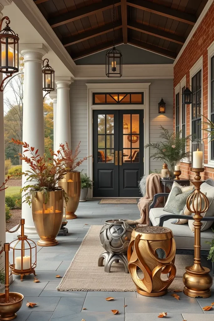 Introducing gold and copper details instantly adds coziness to a fall porch and indicates a sense of class and contemporary design. These metallics reflect the natural daylight and reflect soft light in the evenings, providing a soft glow without being overpowering the setting. They are timeless and when used sparingly, they can be used in any design style, whether transitional to contemporary.