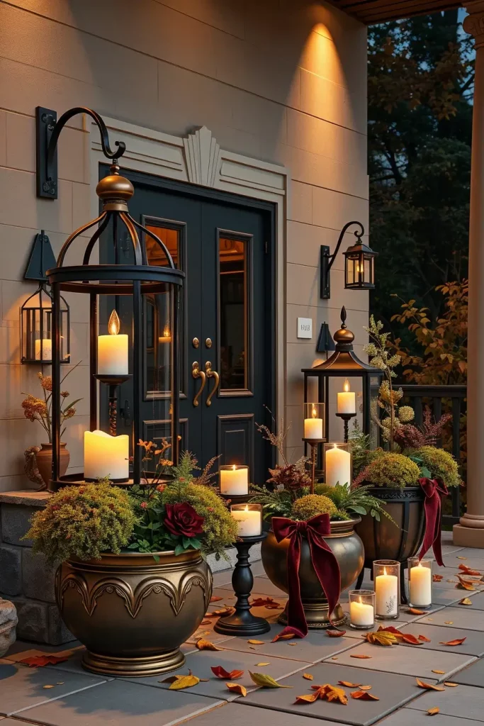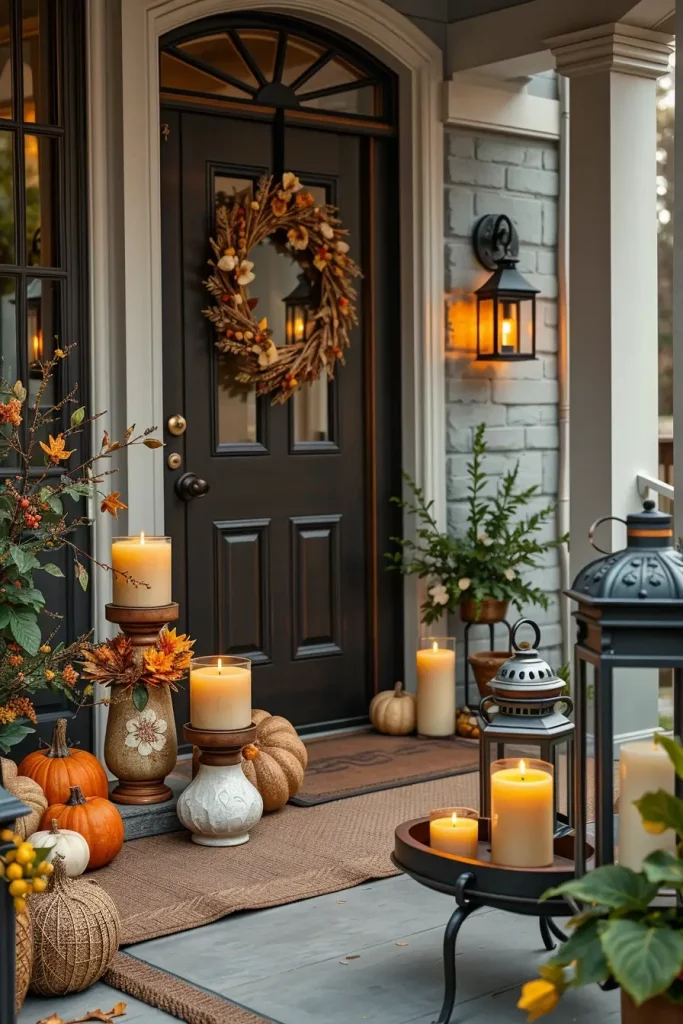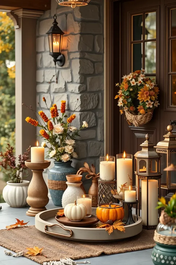 The smell is a very underused aspect of fall porch decor, in my opinion, and I think it is important to have a complete sensory experience. Designer outdoor candles, particularly those with fall scents such as clove, amber or sandalwood, provide a cozy ambiance that is inviting before your guests even arrive at your front door. They also add to the visual narrative of the porch when they are arranged in groups.