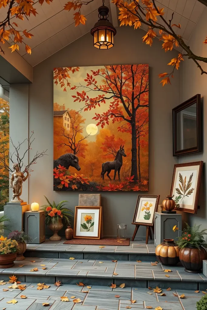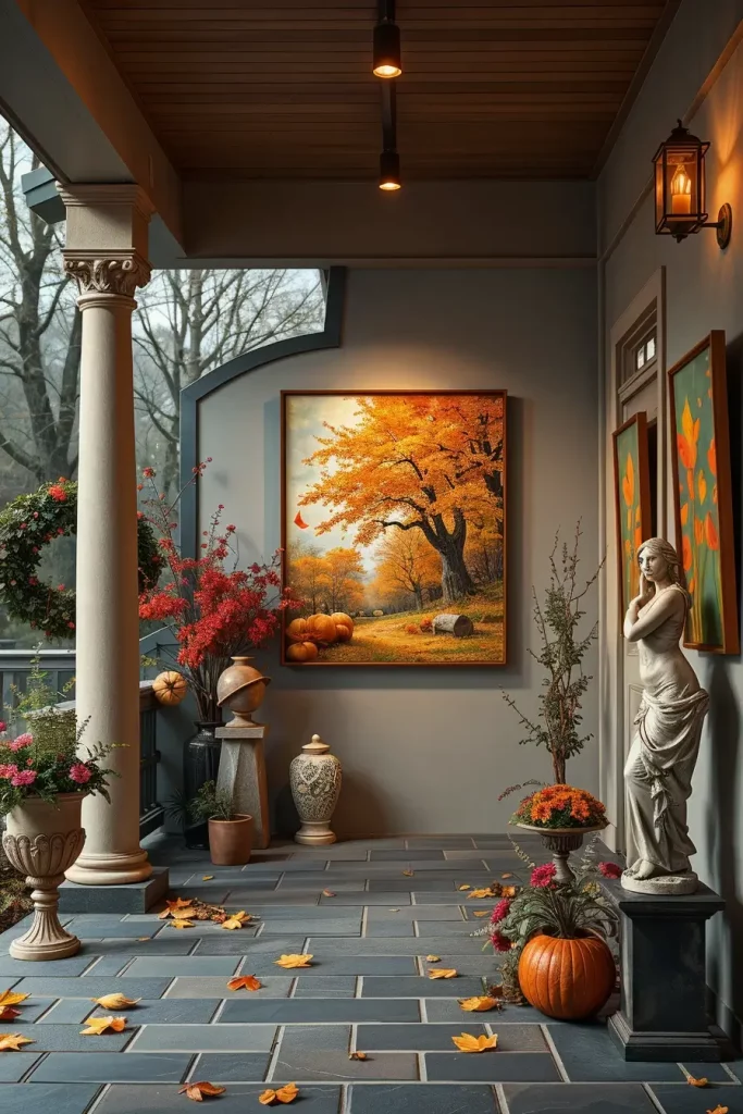 To get a creative and surprise touch on fall porch decor, I recently began to include abstract art pieces with fall themes. This style will make your foyer look like a well-curated gallery, which creates a luxurious atmosphere without being too formal or lacking the coziness of fall. Abstract art allows you to see fall in contemporary shapes, tones, and compositions instead of using only pumpkins and leaves.