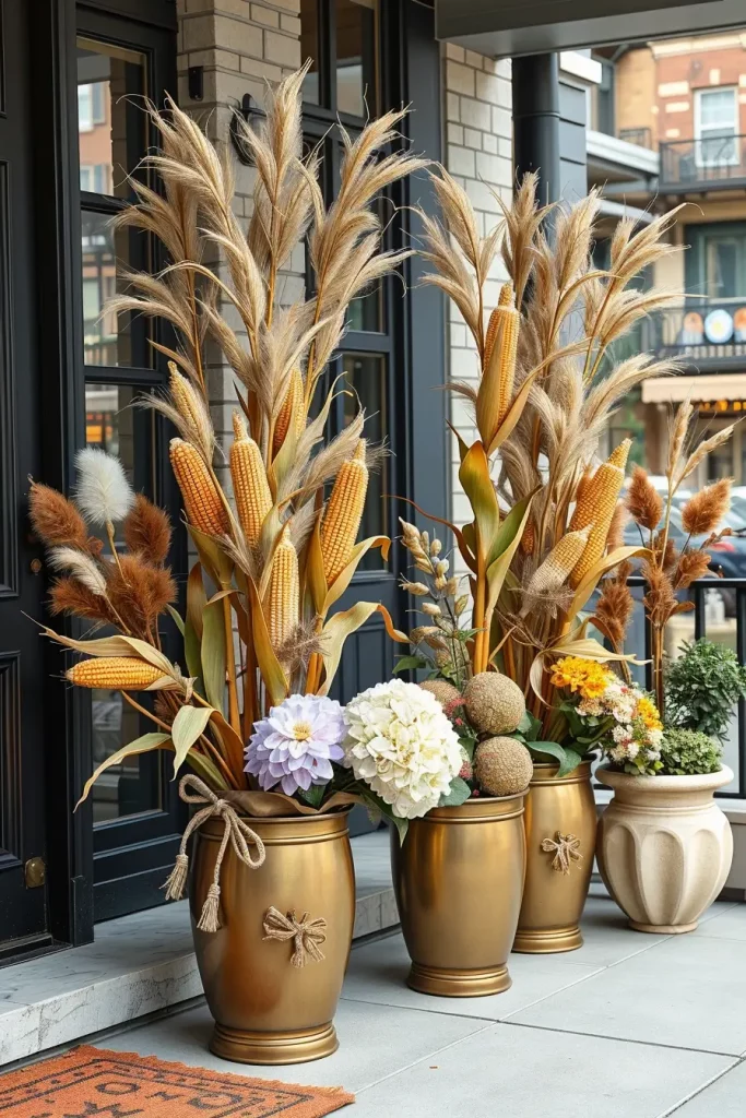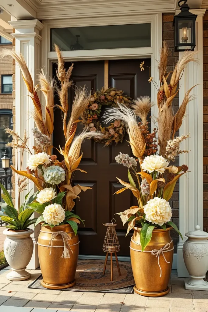Provided there is space, I would surround the stalks with deep green or terracotta ceramic planters to support the autumn theme without making the entry path too busy.