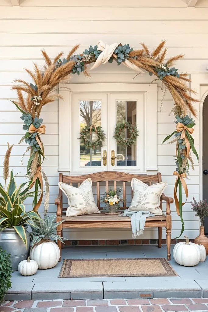 I usually make mine with dried eucalyptus and wheat stems and faux pampas and tie them together with twine and wrap the bottom with a wide velvet ribbon. I will hang them in pairs on each side of the door, or on a bench in a porch in a gentle curve. The neutral colors allow other things, such as lanterns or pumpkins, to pop out and yet provide movement and interest.