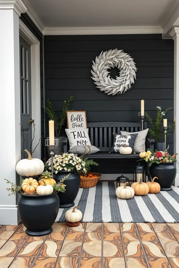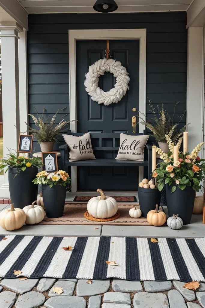 In some cases, black and white color scheme is the most daring statement you can make. This black and white outfit is trendy, urban, and decidedly modern in fall 2025. I adore the effect of this contrast to bring out structure and form – particularly on clean-lined porches. It is a sophisticated but surprising seasonal decor.