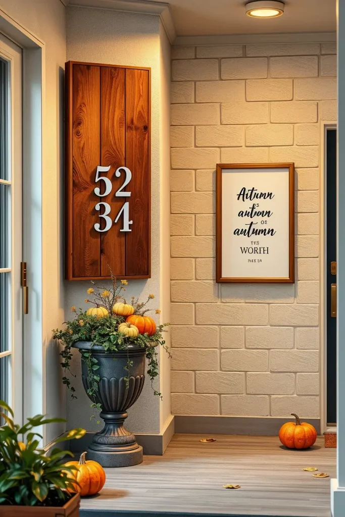 I never fail to add some decorations such as wheat stalks or small decorative gourds around the bottom of the number display. In case there is a wall space, a framed sign with a seasonal quote such as Harvest Home in clean typography will help balance modern design with holiday cheer. A planter under the numbers that is mounted to the wall and filled with trailing ivy and mini pumpkins brings in movement and softness.