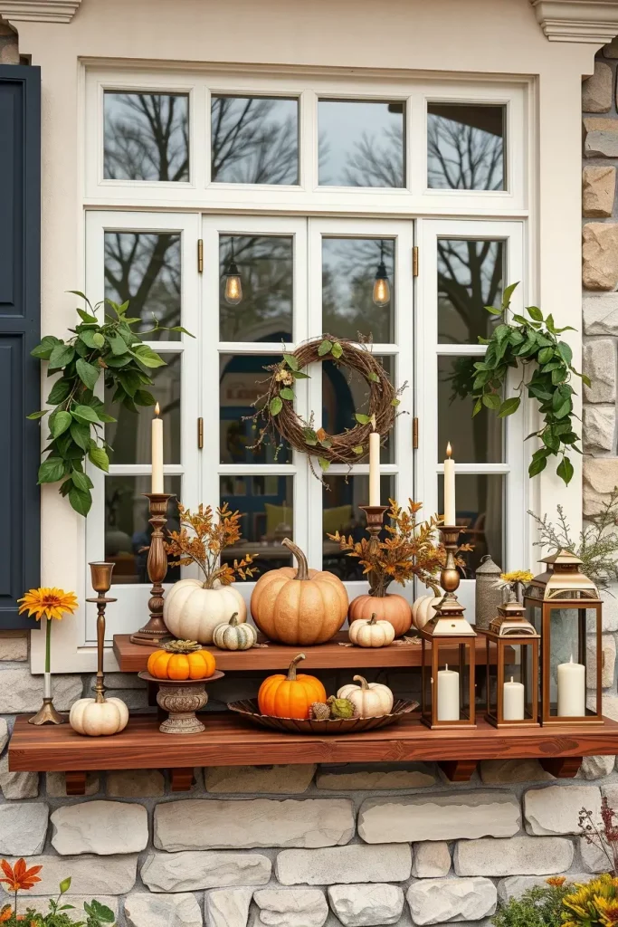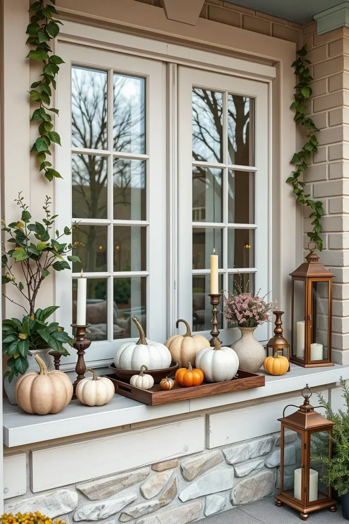 Ledges on windows can be quite neglected, yet they can become one of the highlights of your fall porch decor with a little bit of care. In 2025, I suggest a more advanced design style, which will combine seasonal features and simplicity of lines. I usually begin with a foundation of natural wood trays or iron brackets and add glass cloches, mossy pumpkins and antique-looking candleholders. It is a perfect arrangement to obtain symmetry and coziness without clutter.