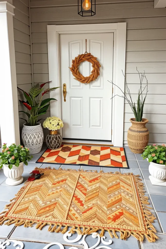 A tricky design move that gives an immediate texture and interest is layering doormats. Everything starts with a big neutral rug, jute, sisal, or a low-pile weave in a warm oatmeal hue. I place a more decorative fall-themed doormat on top with bold patterns such as gingham, herringbone or a fancy script welcome message. This adds dimension and prevents the decorative mat being worn out.