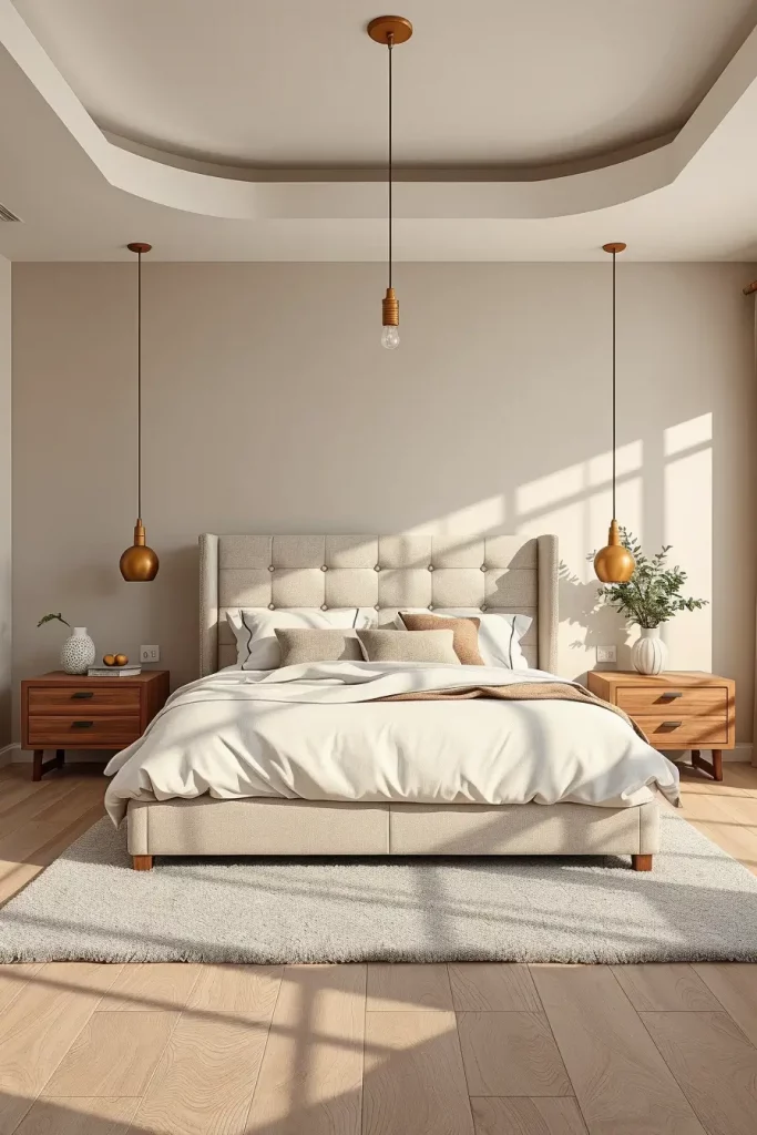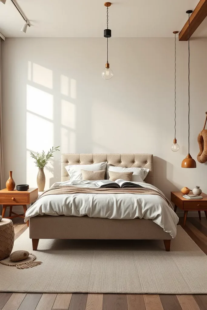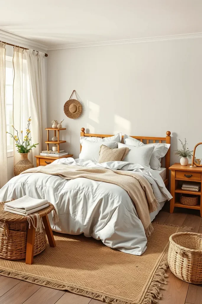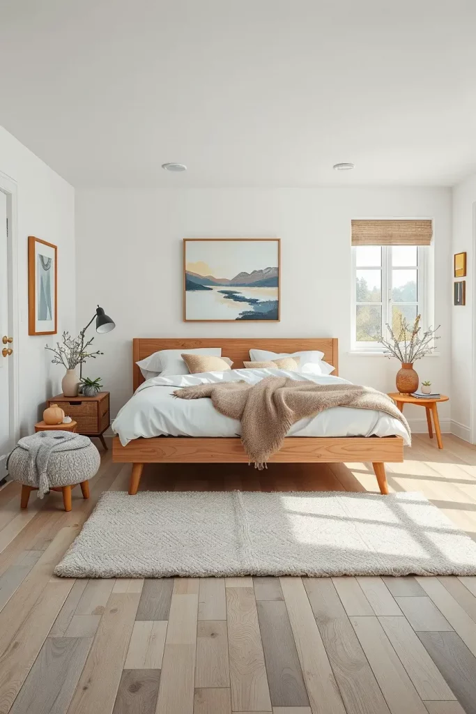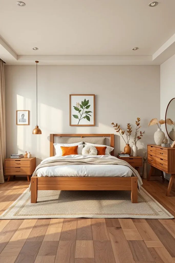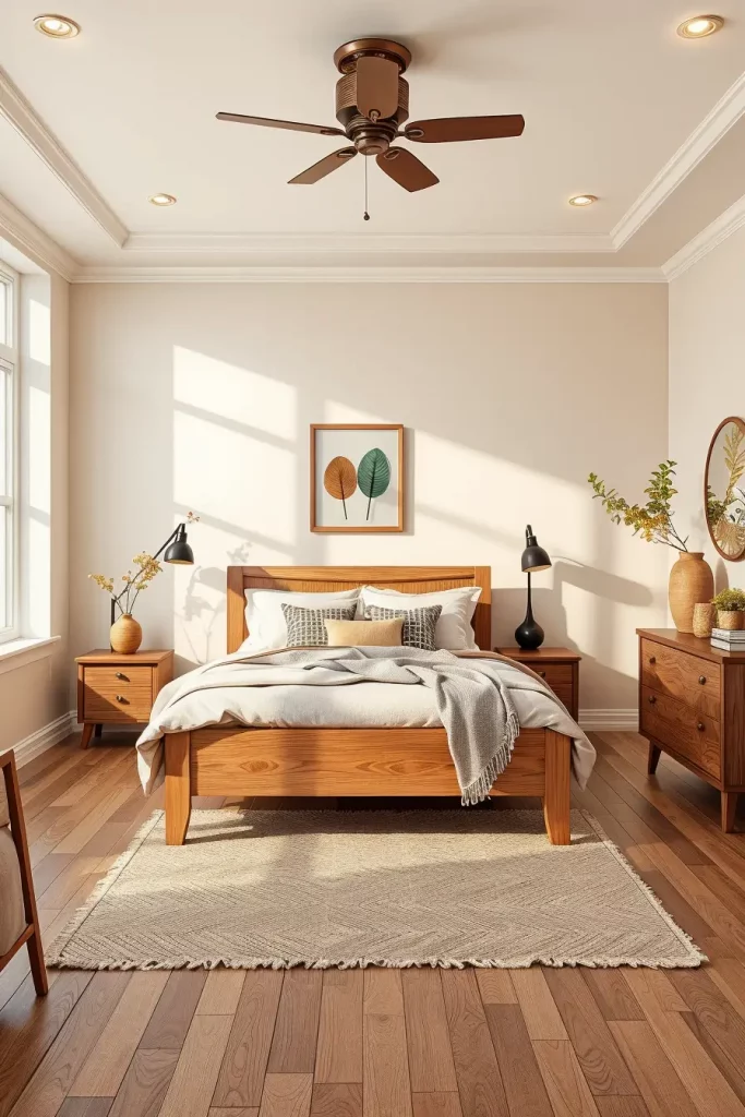 Furniture wise, I would like light oak or walnut bed frames with matching nightstands. Wooden dresser or console may be added to the appearance. When neutral rugs soften wooden floors, they serve to bind the space. The theme is finished with accessories like carved bowls or picture frames in wood colors.