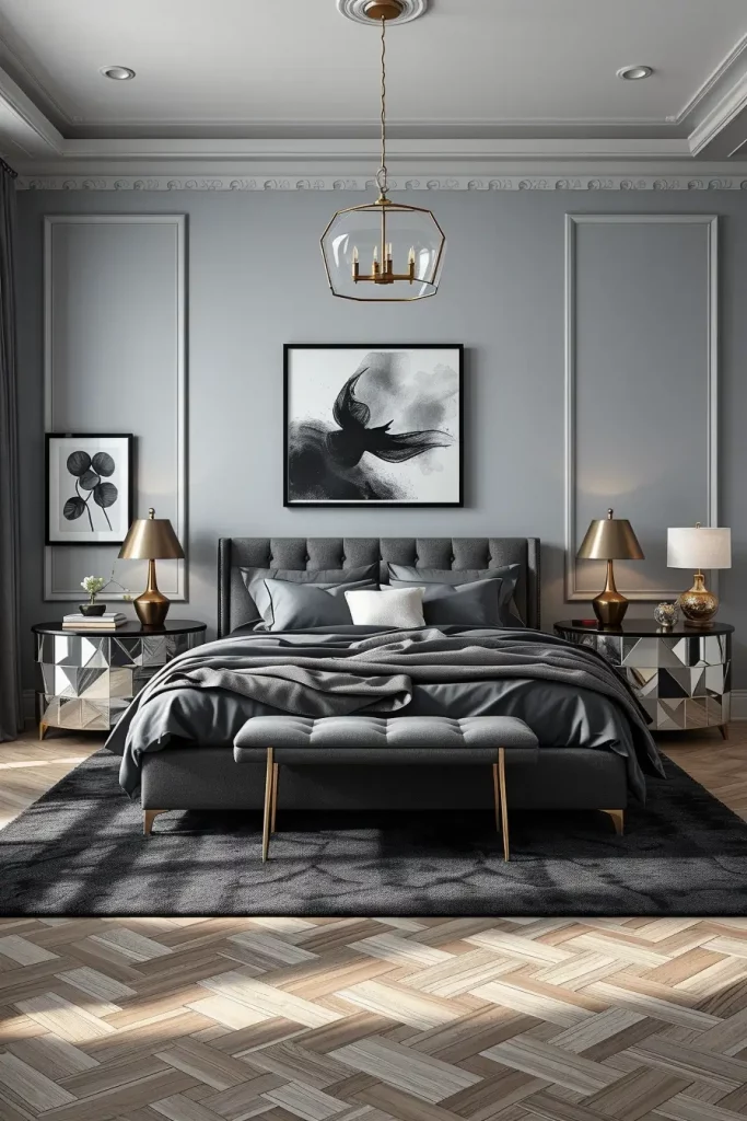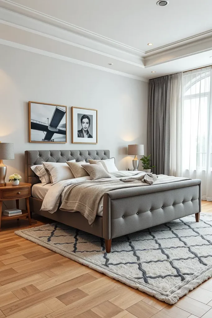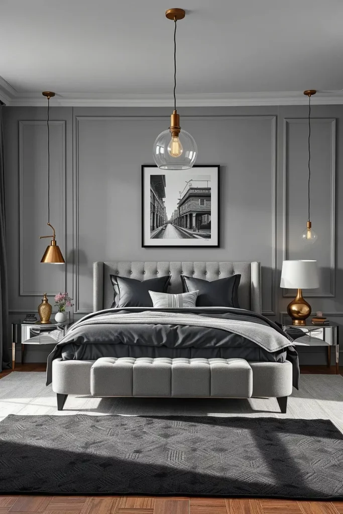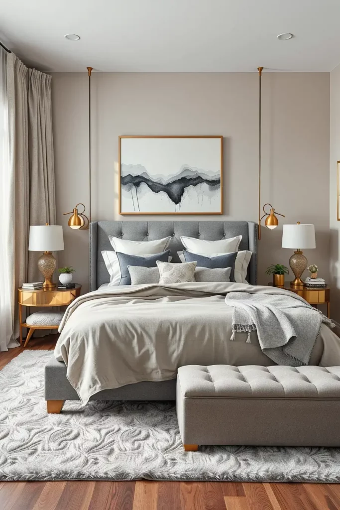 I tend to combine gray by using upholstered headboards, plush area rugs, and light gray bedding with darker accent pillows. This palette is perfectly matched by metallic bedside lamps in brushed nickel or matte black pair. To avoid it appearing flat, I introduce a combination of textures: velvet cushions, linen curtains and wool throws.