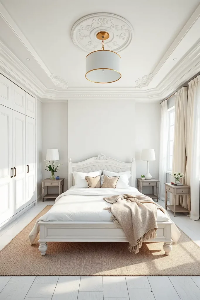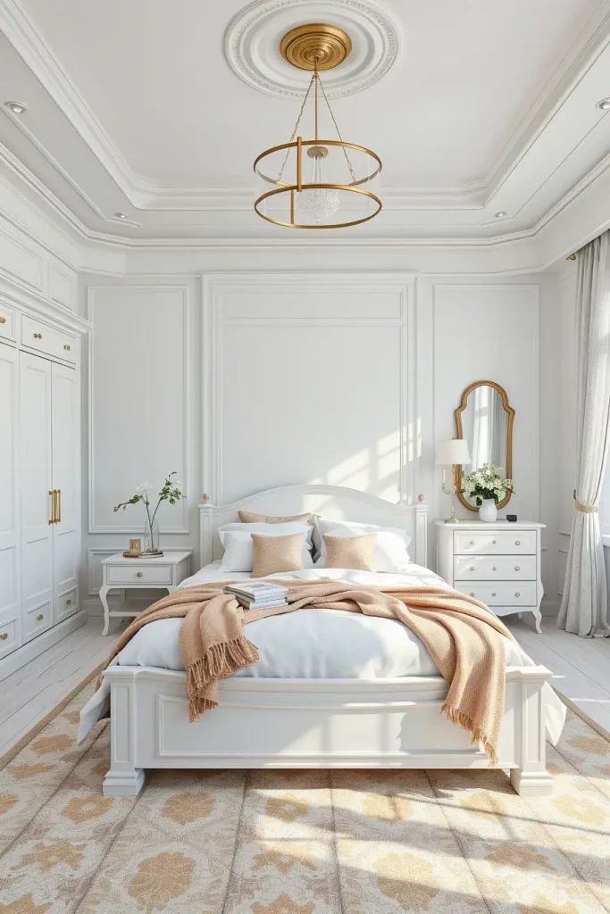 The furniture in such rooms is typically a white wooden bed, glossy white wardrobes and matte side tables. I combine plush fabrics like wool throws and sheer curtains to make the room comfortable. White-on-white is not sterile it is a matter of overlaying hues to create a hint of depth.