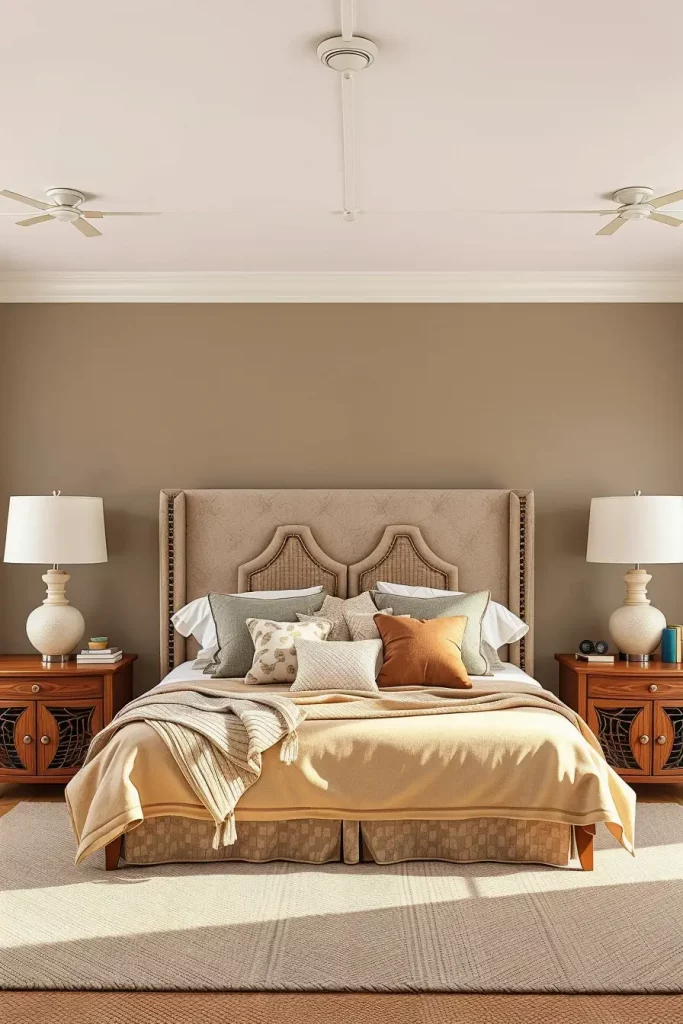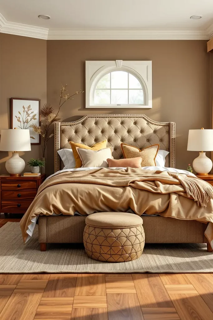What I would add here is a woven or textured headboard to add the natural appeal of these tones. It adds a touch of feel that adds to the bedroom ambience.