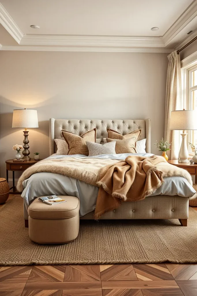 The first thing that I do when designing a comfortable neutral bedroom is to start with textures to add depth. The neutral palette does not imply that the space is to be flat-it only provides me with the opportunity to mix such materials as wool, linen, cotton, and faux fur to create a warm and comfortable appearance. This method is among the most effective to create a comfortable neutral bedroom without using striking colors in 2026.