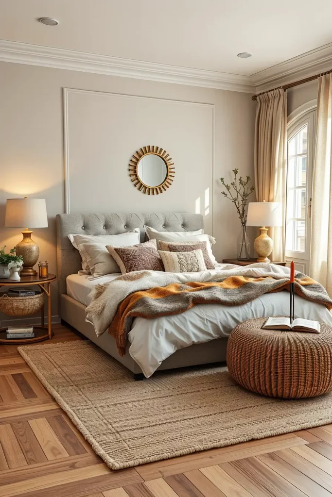 Balance is the thing I consider when designing a room. A bed frame is upholstered in beige and is accompanied by walnut nightstands that make the space very beautiful. A warm brown throw blanket, soft taupe curtains, and a caramel-colored rug are used to overlay the appearance. These touches are not just stylish but they are also useful in the establishment of a comfortable environment that is purposeful.