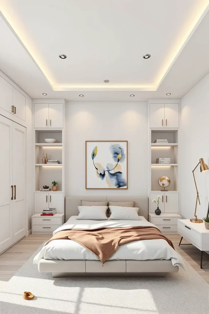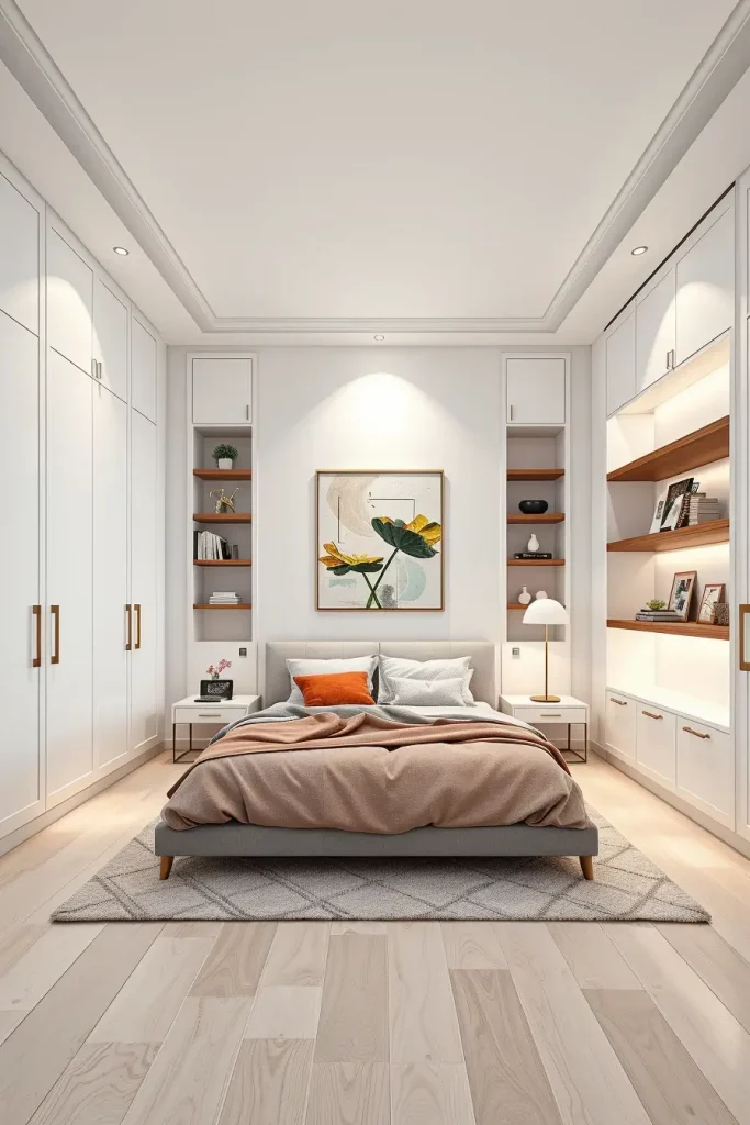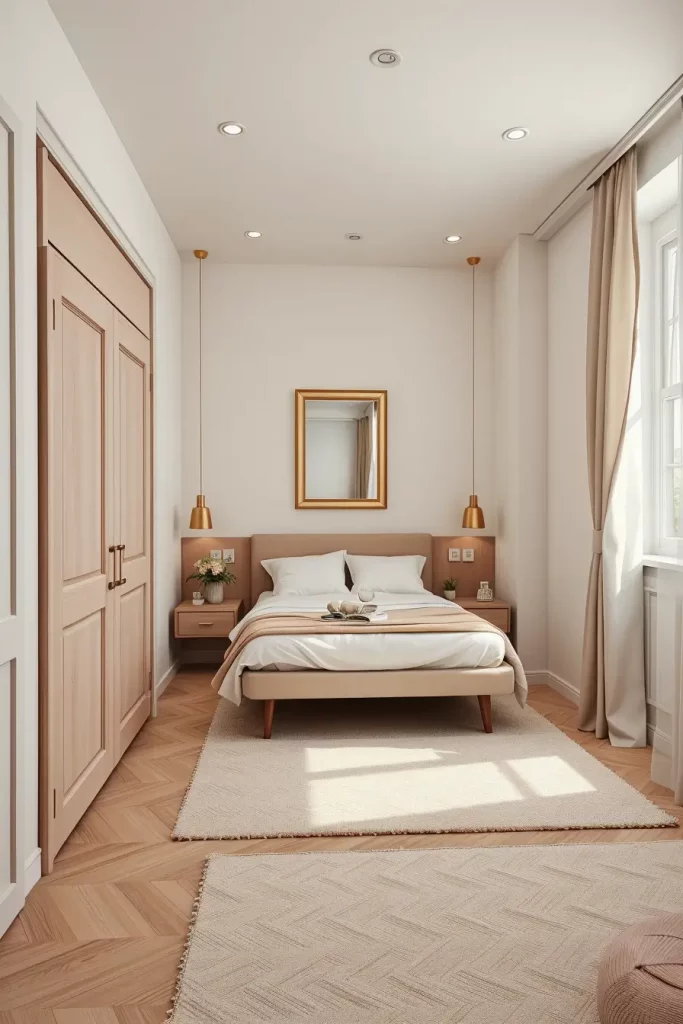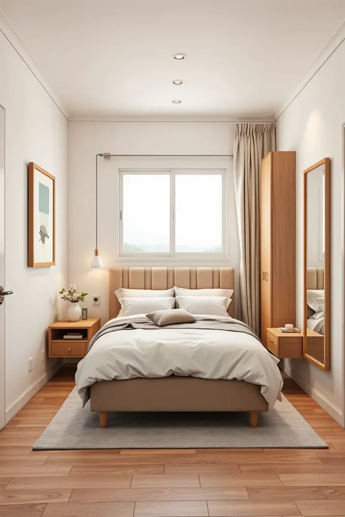 The necessary furniture consists of a bed with inbuilt storage, floating nightstands, and slim wardrobes that are well integrated into the walls. I also suggest the use of mirrors that are framed in neutral colors because they reflect light and increase the space. Bedding must remain light cotton and linen in light colors make the room feel airy.