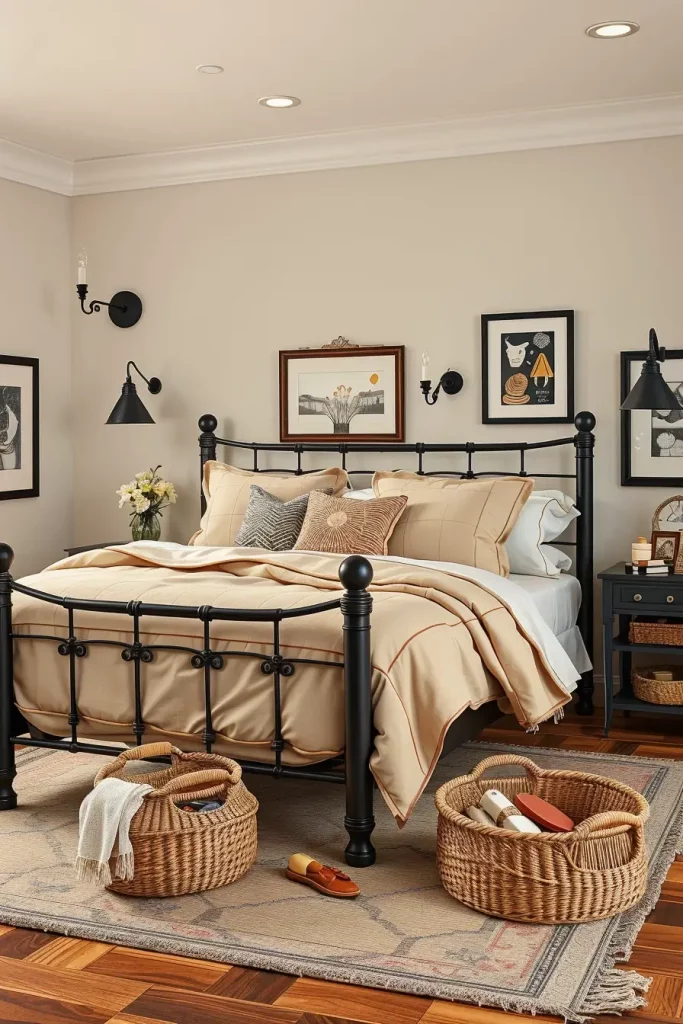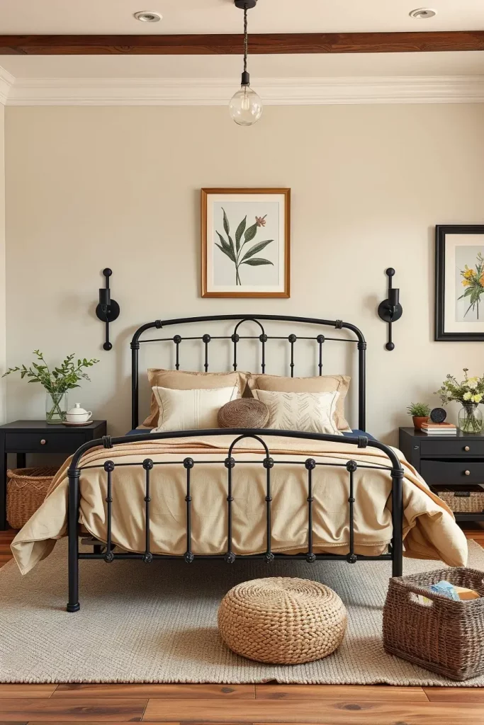 Most neutral bedrooms are dedicated to light colors, but I believe that rustic black details can be very dramatic and deep. This is still the trend in 2026 where individuals are trying out the slightest contrasts. The beige and cream softness can be compensated by a black metal bed frame, rustic black lamps, or black-framed artwork.