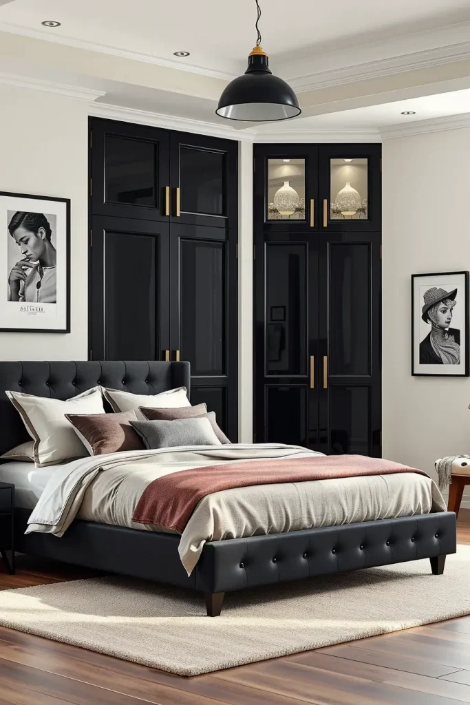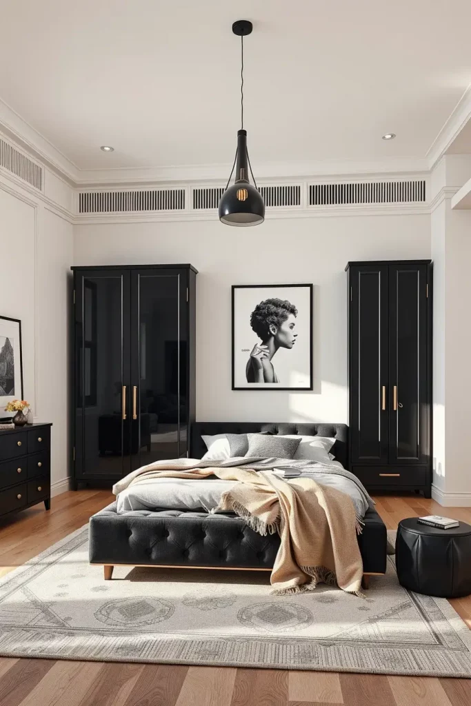 The furniture typically consists of a black bed frame, neutral bedding in beige or cream and smooth black wardrobes. The palette is unified with the help of accessories such as black-and-white art or geometric lamps. The black furniture is softened with a neutral rug.
