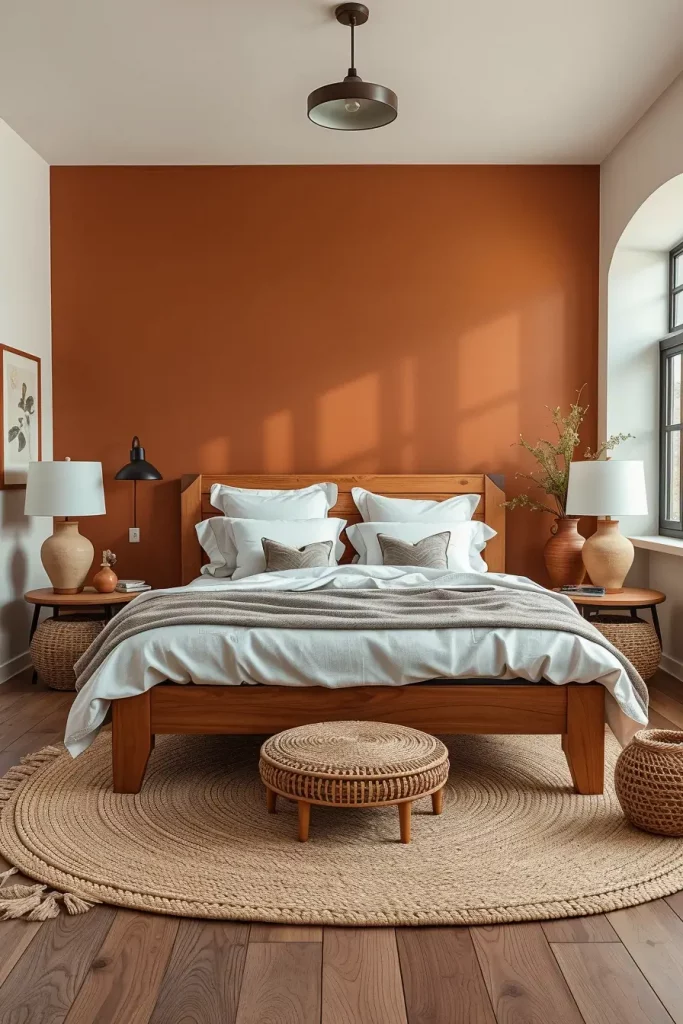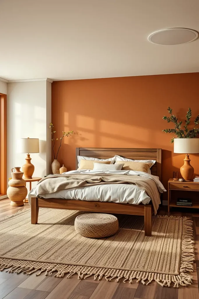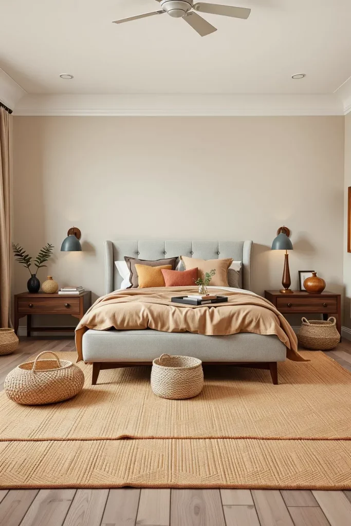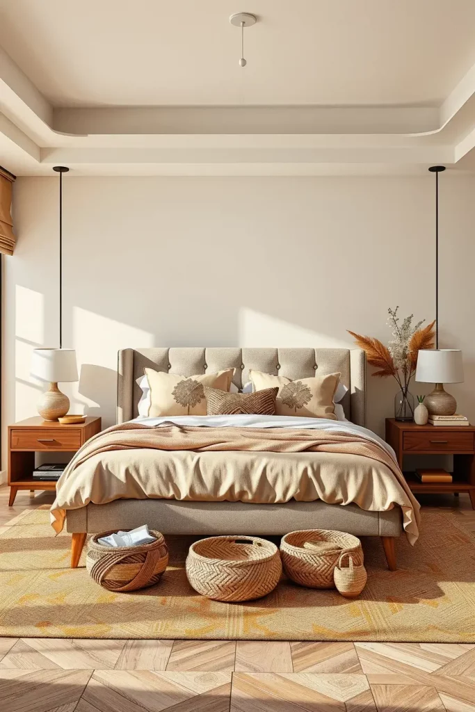 I would also include here natural fiber wall hangings or textured headboards to add even more depth and authenticity to the earthly feel.