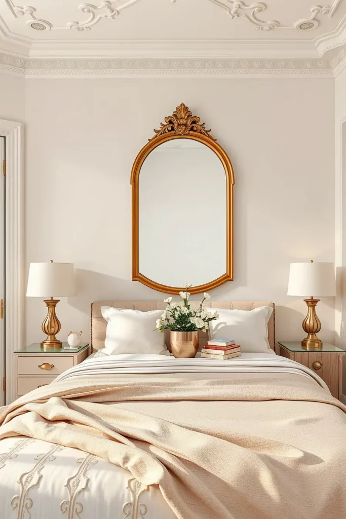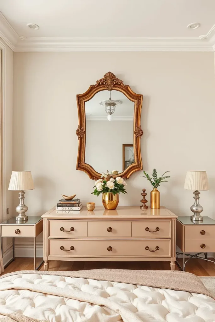 Design-wise, I like metallic bedside lamps, picture frames and drawer handles. The space is luxurious but subtle with a gold-framed mirror above a beige dresser or silver-trimmed sconces by the bed. These should be combined with cream or ivory walls so that the metallic accents are not overbearing the space.