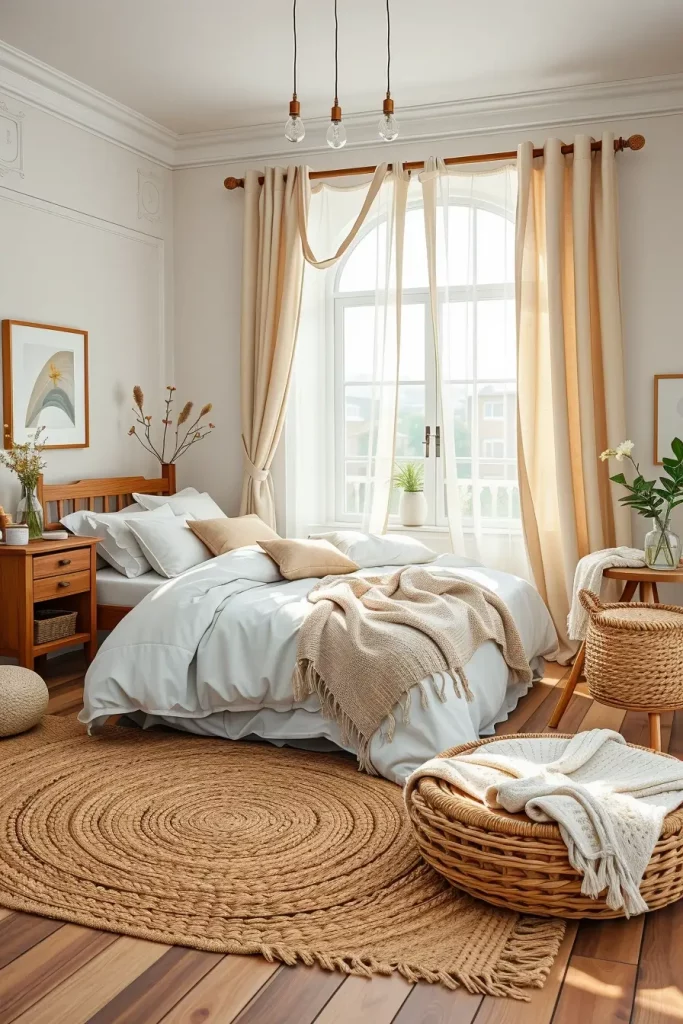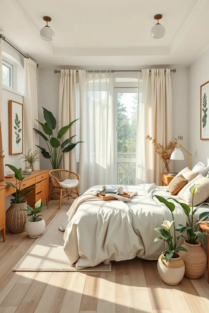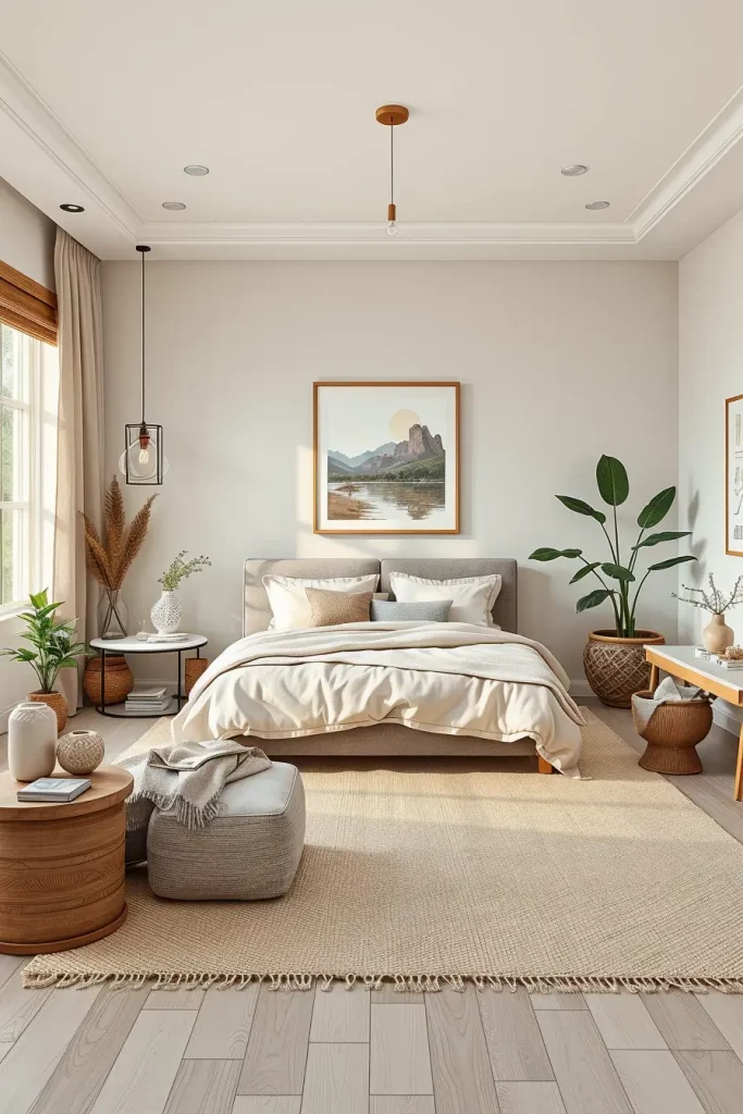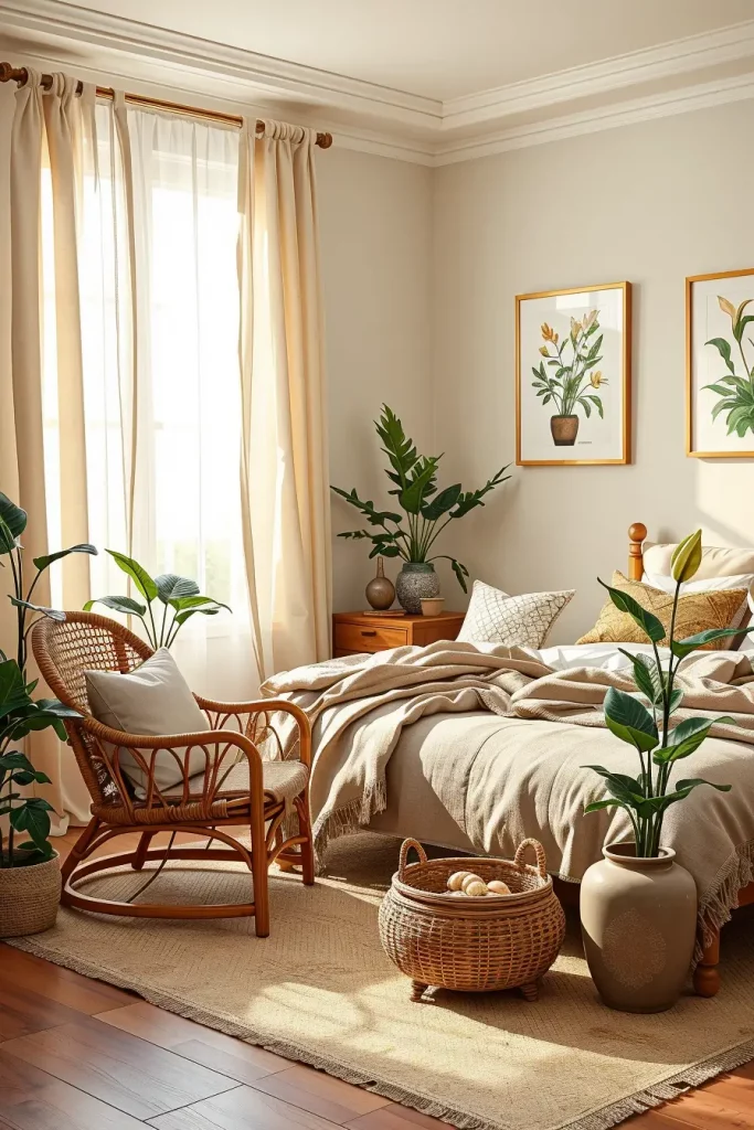 In choosing furniture and other decorative elements to this style, I tend to choose natural wood dressers, woven baskets, and rattan chairs. The naturalistic nature of these pieces is quite well matched with neutral walls and floors. Ceramic or terracotta pots can be used to place houseplants on windowsills, nightstands or hanging in ceiling planters to add freshness to the room. I also enjoy the thought of botanical-themed paintings in plain wood or black frames to strengthen the natural theme.