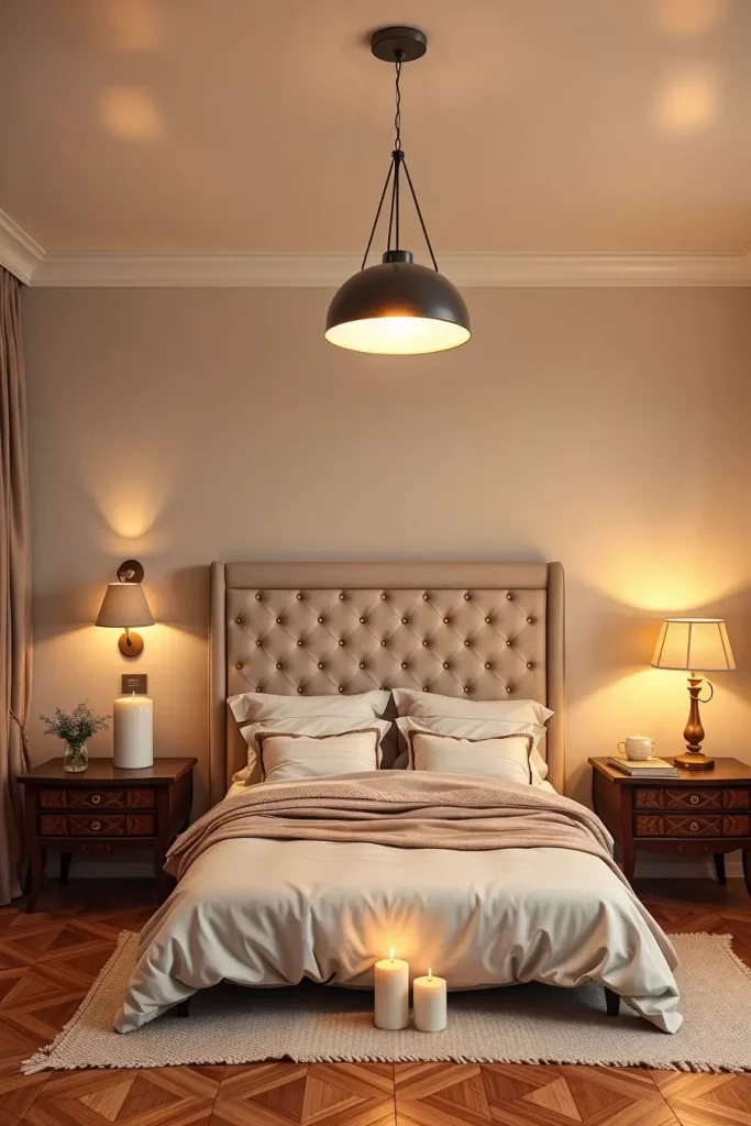 To make this even more, I would include candles or flameless options of the modern type. They provide a secure means of adding flickering, warm light that fits the bedroom design very well.