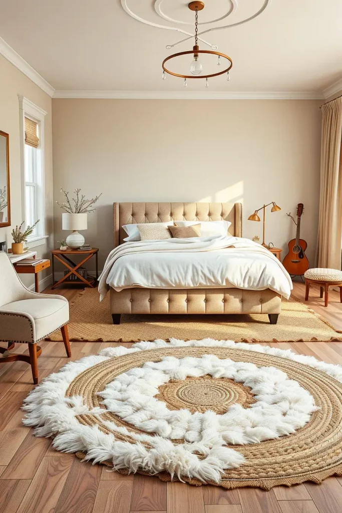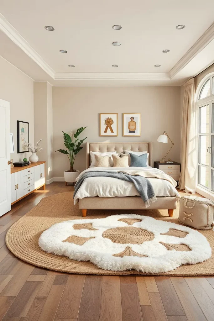 Layered rugs are one of the best methods of adding depth to a neutral bedroom. I usually use a large jute rug as a foundation, on which I put a smaller plush area rug. Such a mix produces a warm and aesthetic effect without breaking the peaceful palette.