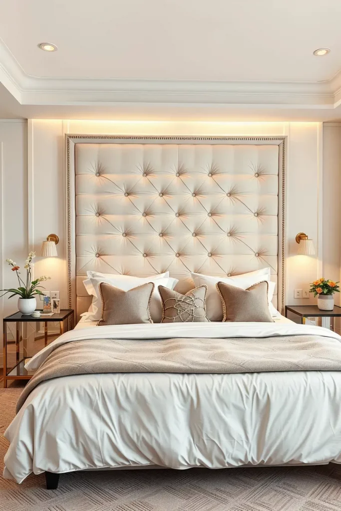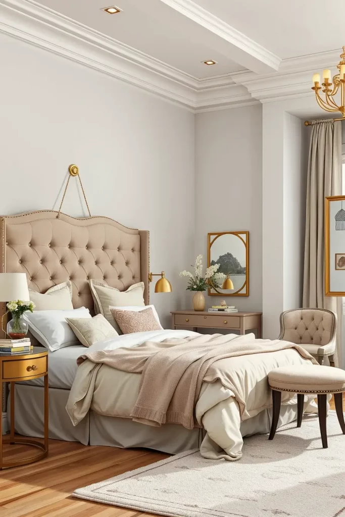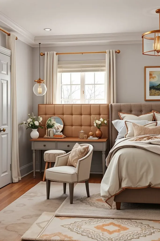 I tend to prescribe a taupe headboard, a layered bedding in ivory, and a light source like sconces or pendant lamps. A neutral finish with a comfortable chair is a vanity corner that is practical and attractive. The space is personalized with accessories such as soft rugs and neutral artwork and does not overpower the space.