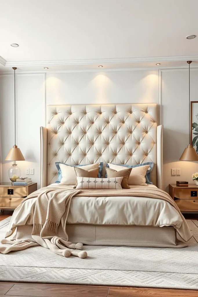 I seek tufted fabric, textured linen or even leather when choosing headboards. These works immediately turn into focal points. Combining them with a few pieces of bedding will keep the focus on the headboard, and neutral throw pillows of matching colors provide balance.
