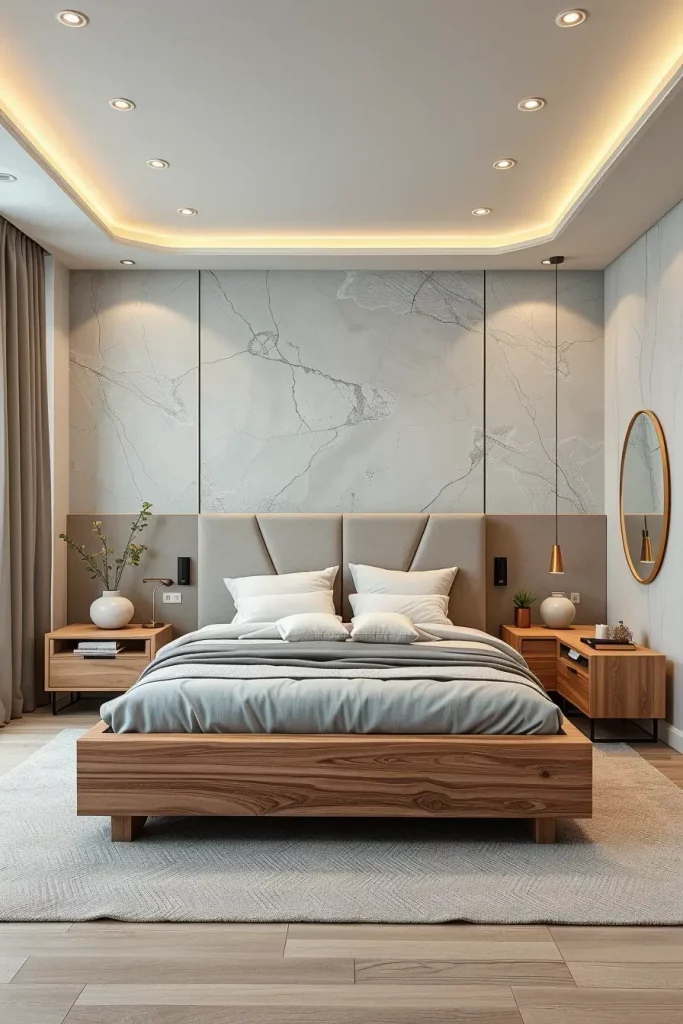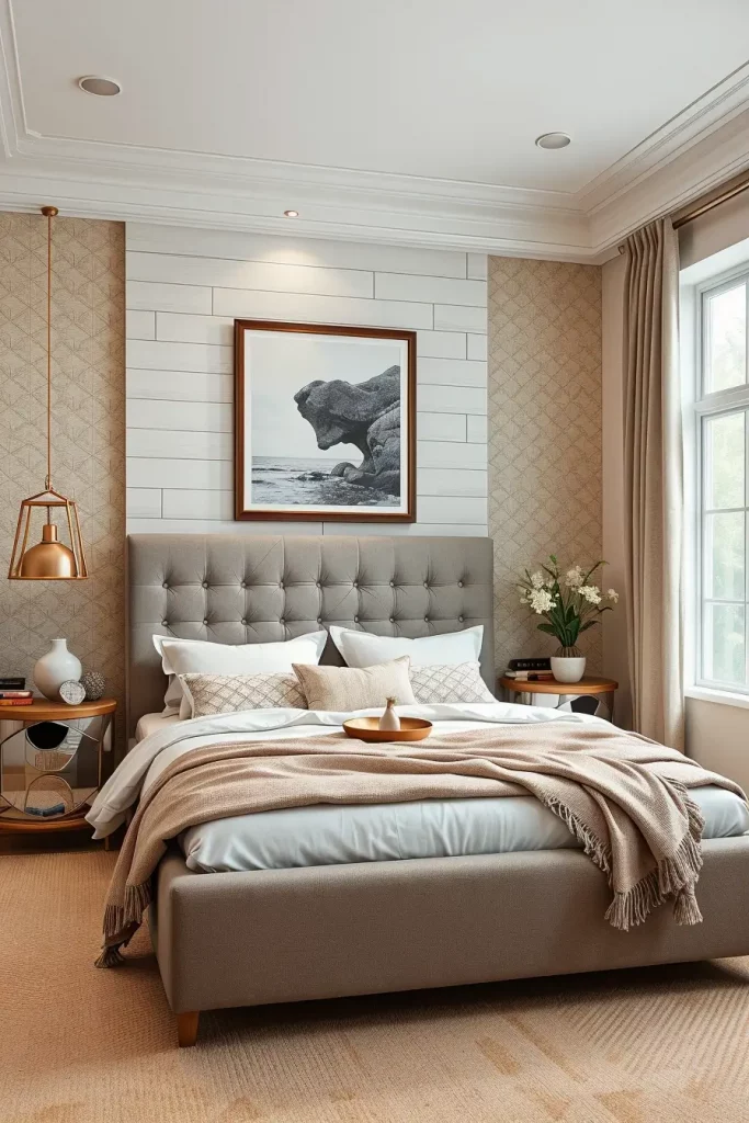I could design it with light gray shiplap, geometric neutral-coloured wallpaper, or soft beige fabric wall covering. These extensions render the wall more of a design element and not a mere background. The combination of them with neutral bedding and plain furniture is the guarantee of balance and prevents the overcrowding of the space.