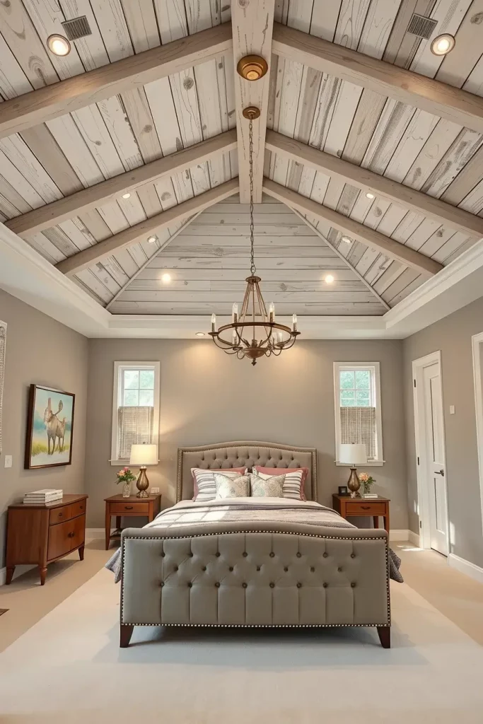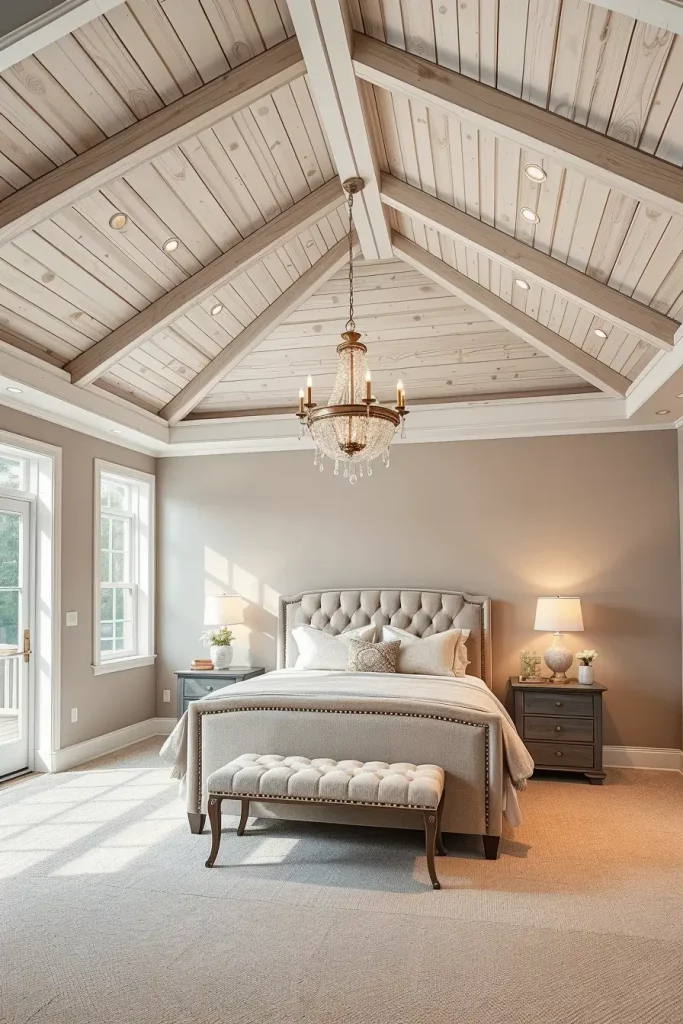 What I would include here is a neutral chandelier or pendant light. This doubles as both a functional lighting and a statement piece that showcases the ceiling design.
