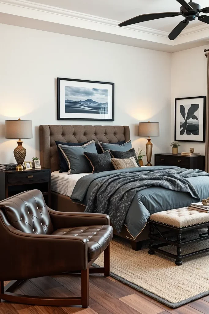 In the case of furniture, my preference is leather chairs, dark wooden nightstands, and bedding made of linen in earthy colors. The space is masculine with clean lines and strong materials that do not make it lose its elegance. The room can be bound together by subtle artwork or black-framed photography.