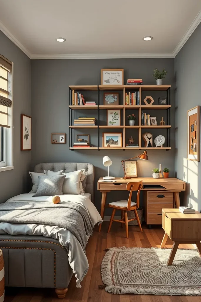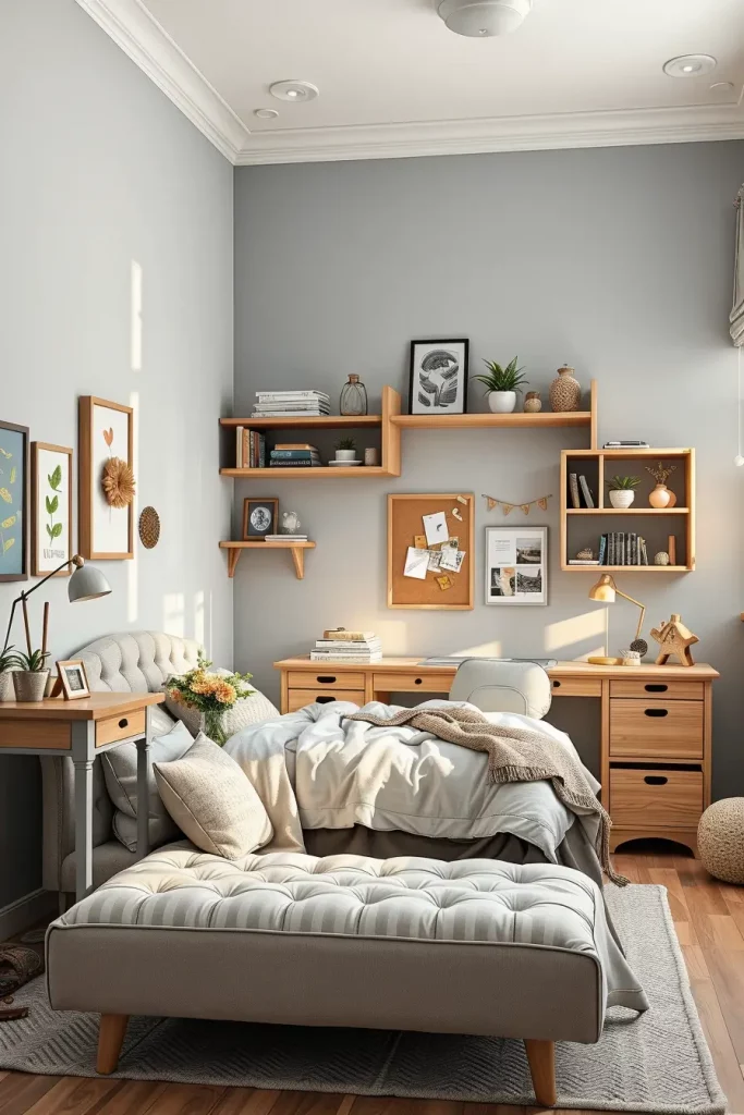 My design is usually neutral walls, an upholstered bed, and multi-purpose furniture such as open shelving. Bedding in ivory or gray gives a serene background, and the seasonal or personal accent can be added with throws, pillows or wall art. The room is finished with a desk of light wood finish.