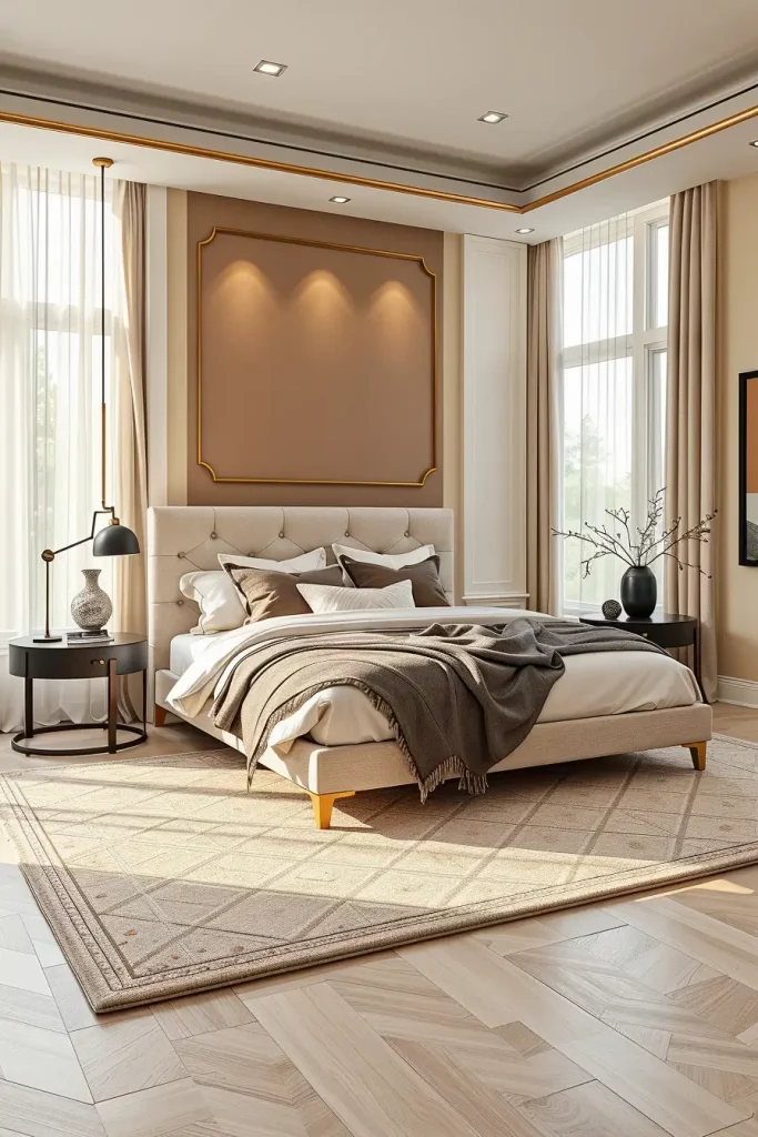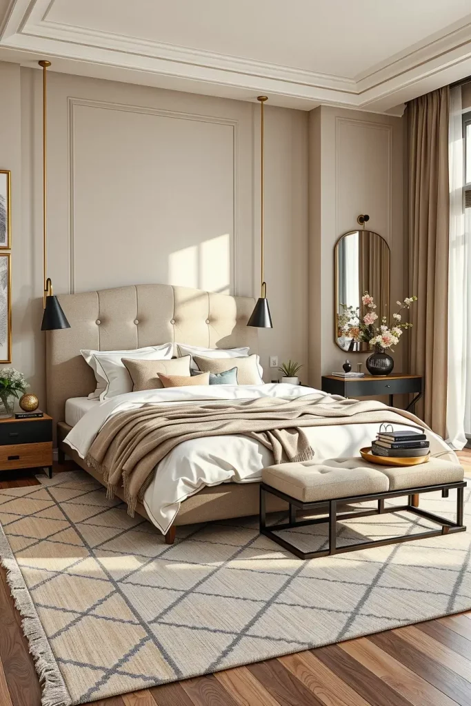 I would also suggest using statement furniture in such interiors such as upholstered headboards in natural fabrics, smooth nightstands with soft metallic details, and low profile modern beds with clean lines. The room can be grounded by neutral rugs with minor geometric designs, and the calming effect of the room can be increased by sheer curtains that screen natural light. I usually combine warm wood with brass or matte black fixtures as a balanced, elegant appearance.