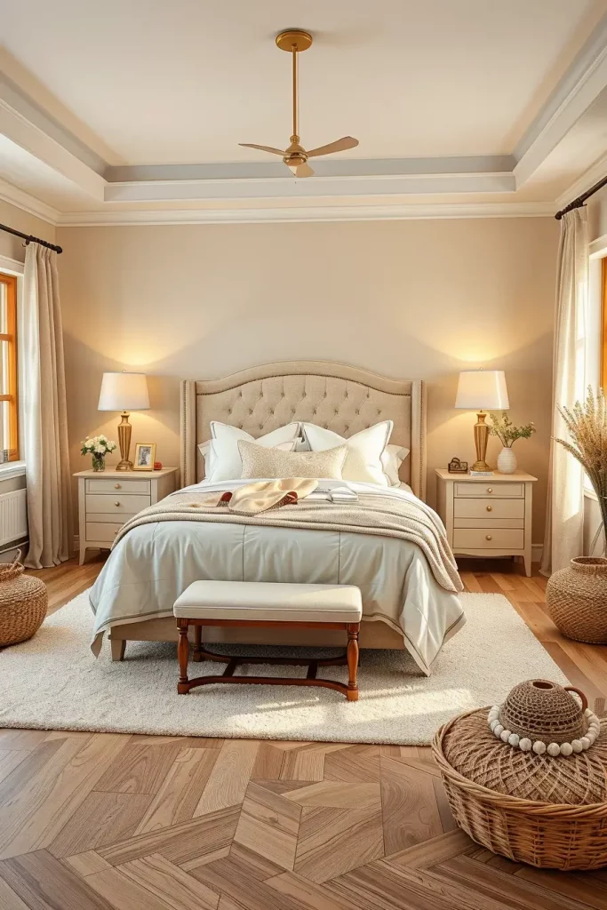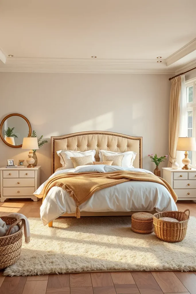 The furniture is typically a beige upholstered headboard, cream linen drapes, and ivory nightstands. I would also recommend the introduction of a plush area rug that improves the comfort aspect. Woven baskets and cream lampshades are accessories that add subtle character and still harmonize.